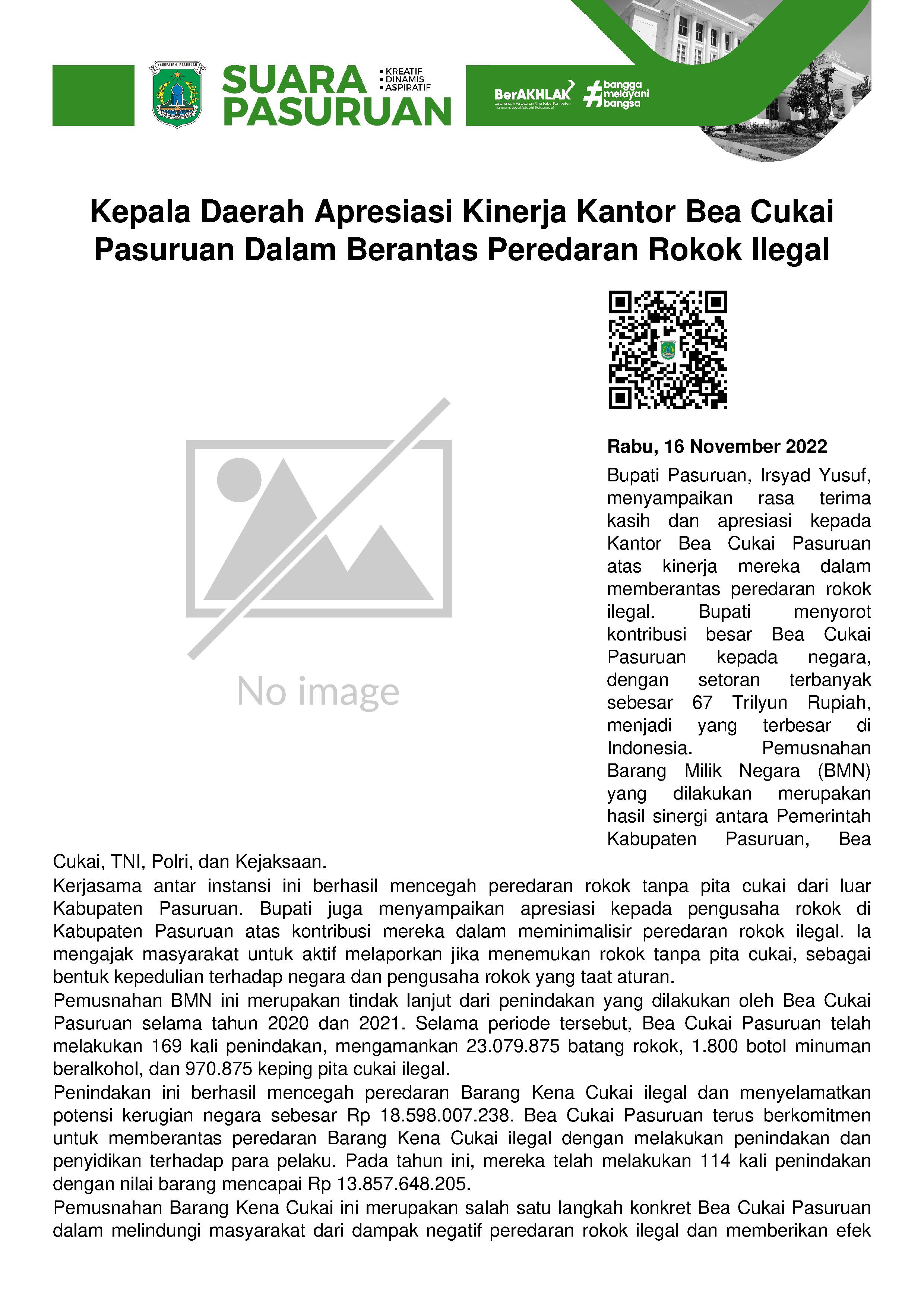 Bupati Irsyad Yusuf mengucapkan rasa terimakasih dan apresiasinya kepada Kantor Pengawasan dan Pelayanan Bea dan Cukai Tipe Madya Pabean (KPPBC TMP) A Pasuruan yang terus mengoptimalkan upaya pemberantasan peredaran rokok illegal. Seperti yang dilakukan hari ini, Rabu (16/11/2022) dalam kegiatan Pemusnahan Barang Milik Negara Hasil Penindakan KPPBC TMP A Pasuruan Periode 2020 & 2021.