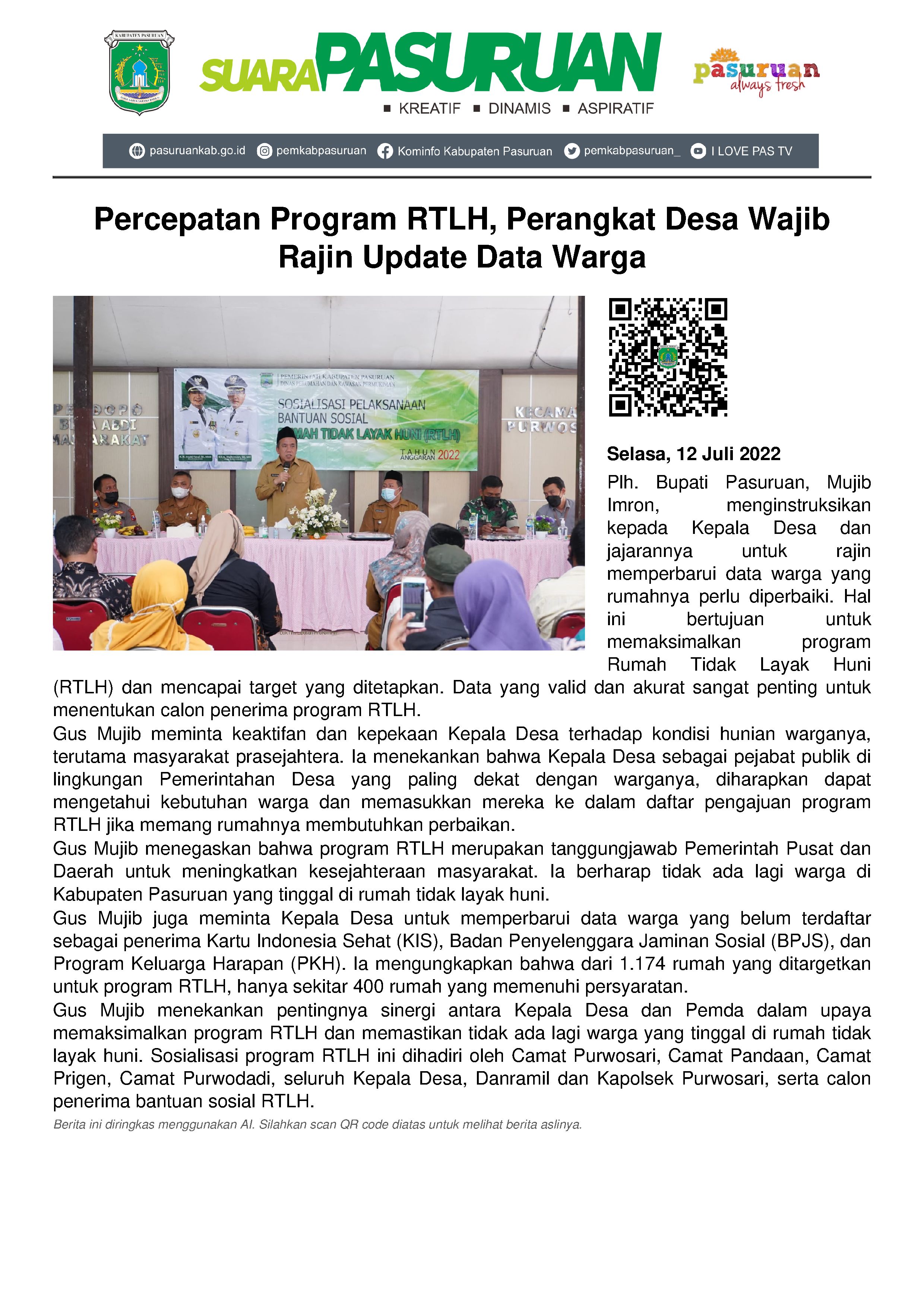 Supaya pelaksanaan program Rumah Tidak Layak Huni (RTLH) lebih maksimal dan sesuai target, Plh. Bupati Mujib Imron menginstruksikan kepada Kepala Desa dan jajarannya untuk rajin memperbarui data. Caranya dengan intens melakukan pendataan terhadap masing-masing warganya yang rumahnya perlu diperbaiki, sesuai kriteria yang disyaratkan.