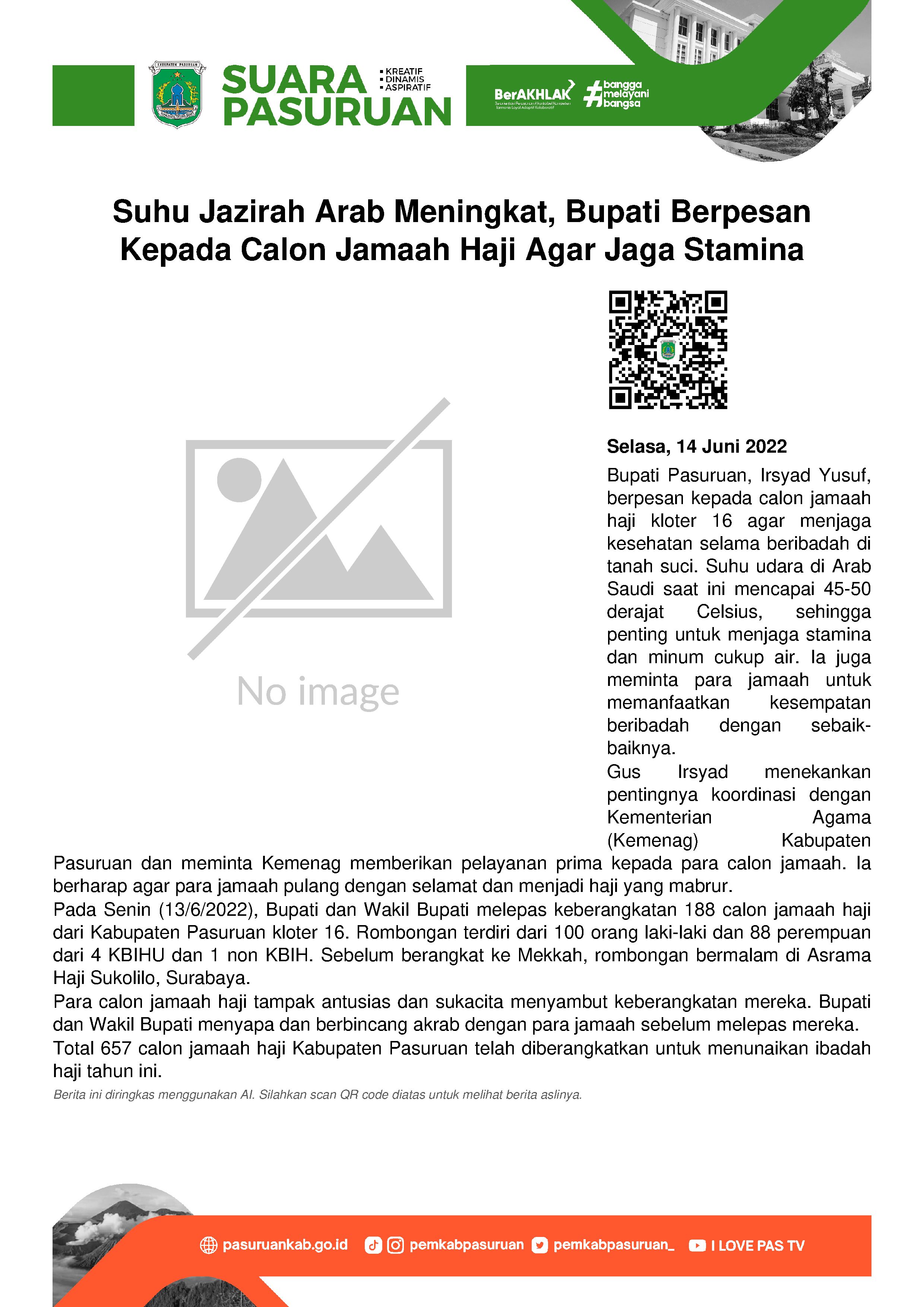 Sesaat sebelum memberangkatkan calon jamaah haji kloter 16 Kabupaten Pasuruan, Bupati Irsyad Yusuf berpesan agar tetap menjaga kesehatan selama beribadah. Terlebih kondisi cuaca yang begitu terik di tanah suci.
