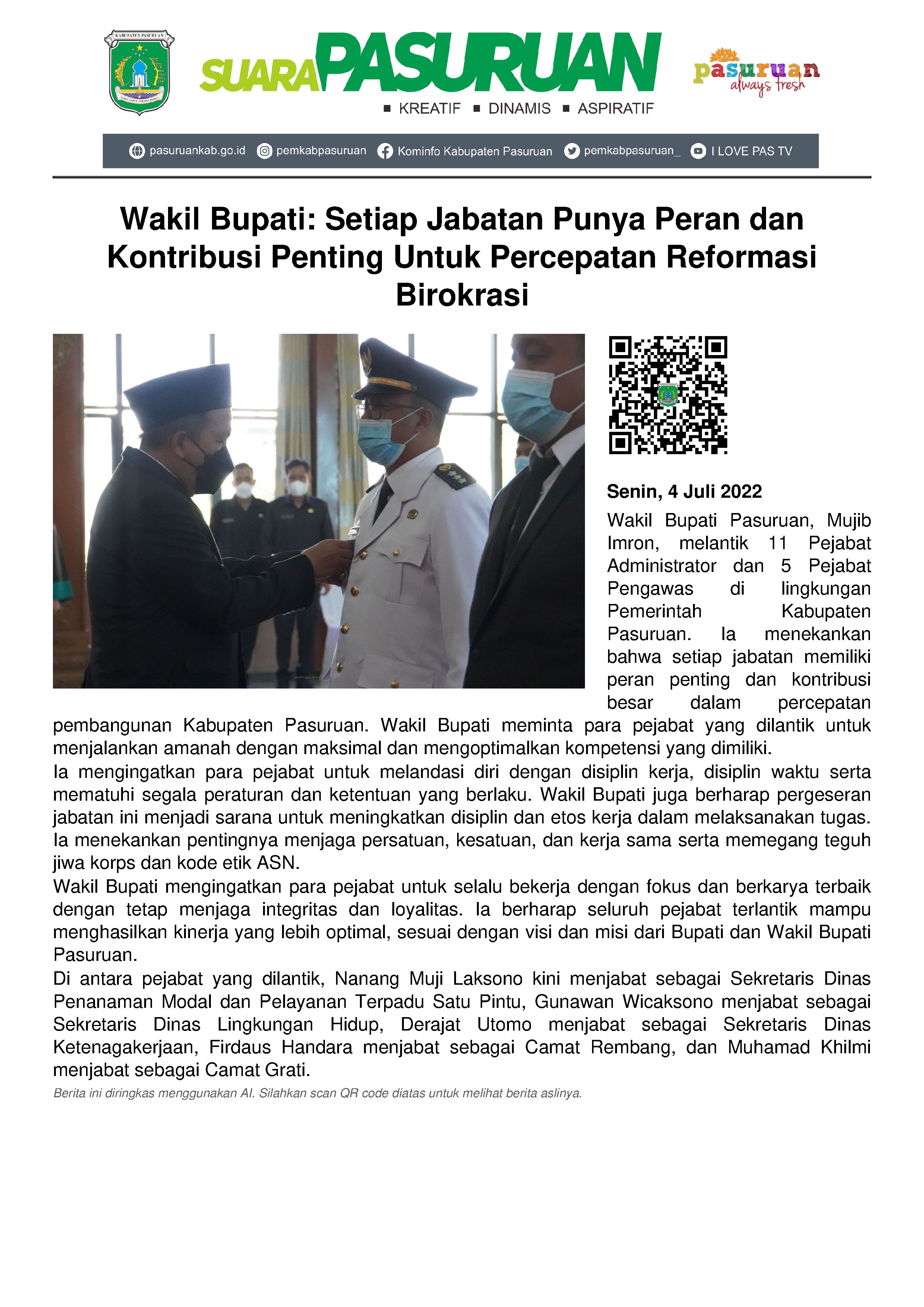 Di sisi lain, Lantik 11 Pejabat Administrator dan 5 Pejabat Pengawas di lingkungan Pemerintah Kabupaten Pasuruan, Wakil Bupati Pasuruan mengingatkan kepada para pejabat terlantik agar selalu bekerja dengan fokus dan berkarya terbaik dengan tetap menjaga integritas dan loyalitas. Harapannya sudah pasti, seluruh pejabat terlantik mampu menghasilkan kinerja yang lebih optimal. Sesuai dengan visi dan misi dari Bupati dan Wakil Bupati Pasuruan.