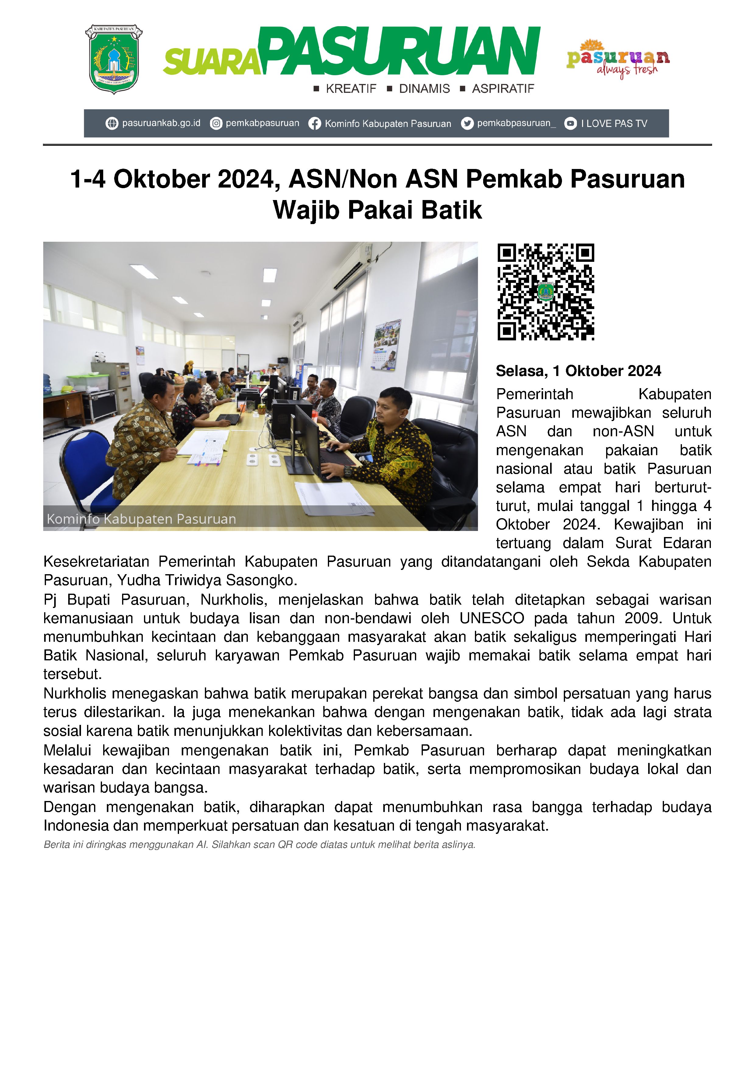 Empat hari berturut-turut, yakni mulai 1-4 Oktober 2024, seluruh Karyawan-Karyawati Pemerintah Kabupaten Pasuruan diwajibkan untuk memakai pakaian batik nasional/batik pasuruan.