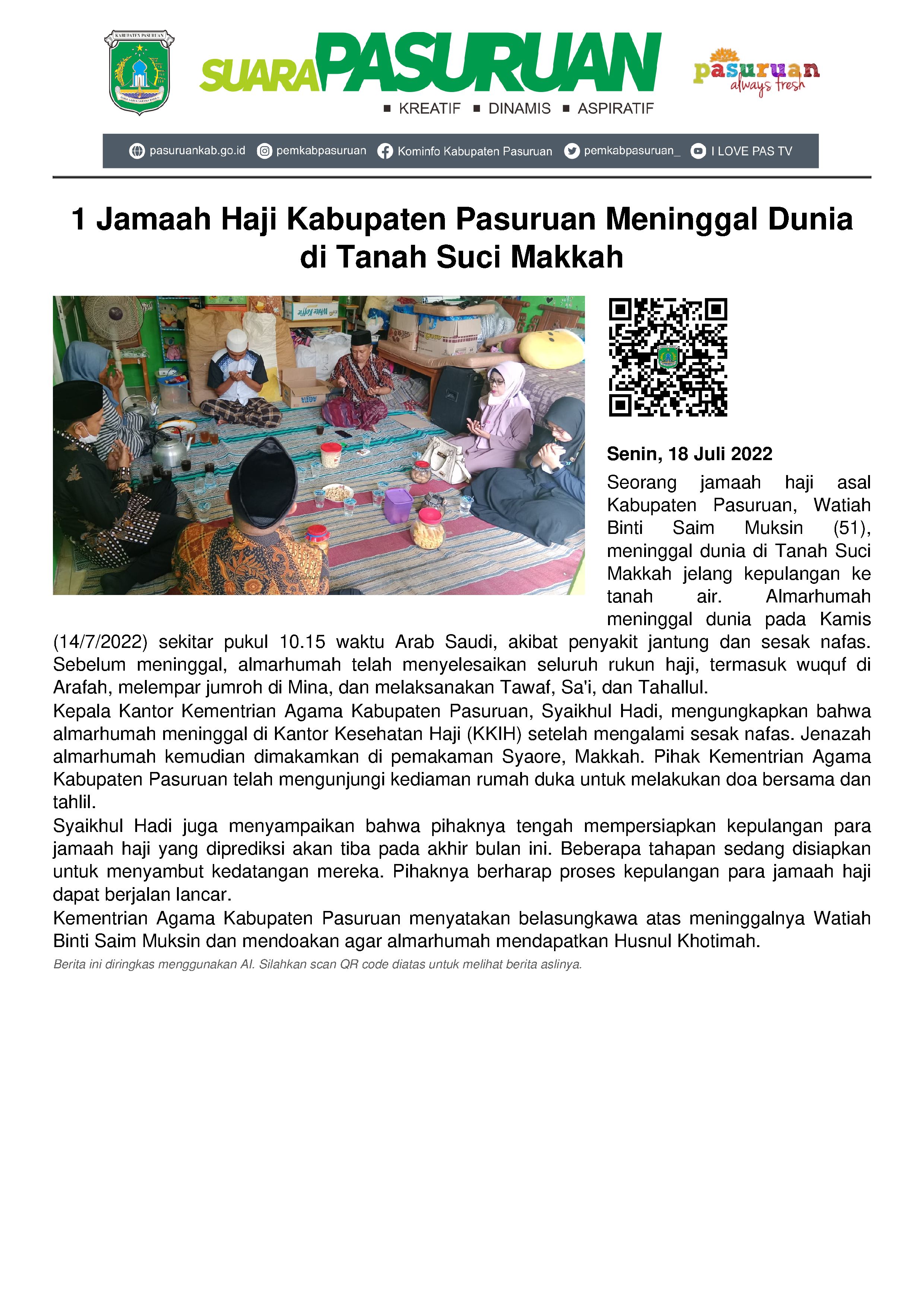 Jelang kepulangan ke tanah air, salah satu jamaah haji Kabupaten Pasuruan, meninggal dunia di Tanah Suci Makkah.