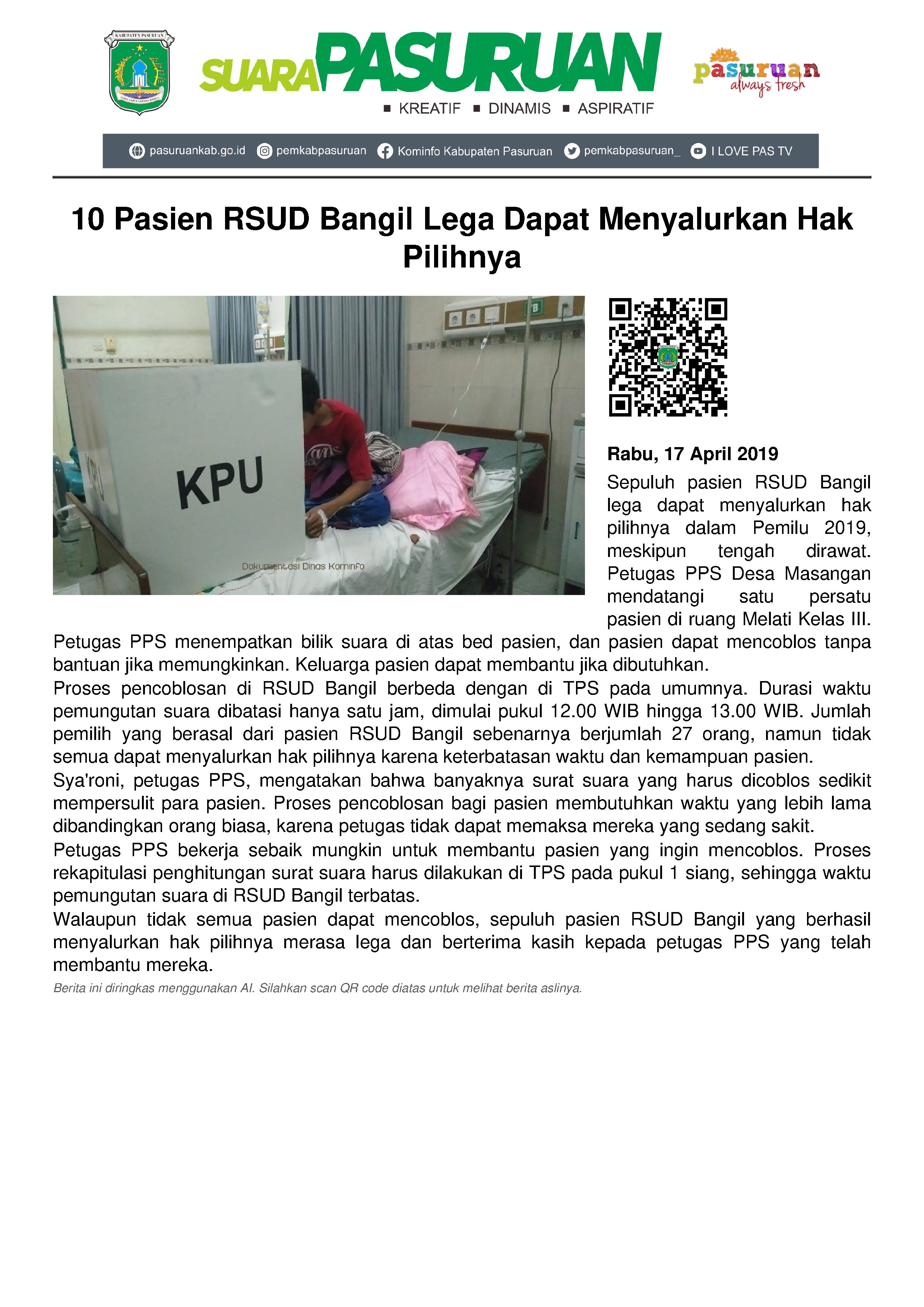 “Kami sebisa mungkin membantu para pasien yang sudah membawa A5. Berarti mereka memang ingin dan siap untuk mencoblos,” kata Sya’roni, di sela-sela membantu pasien RSUD Bangil.