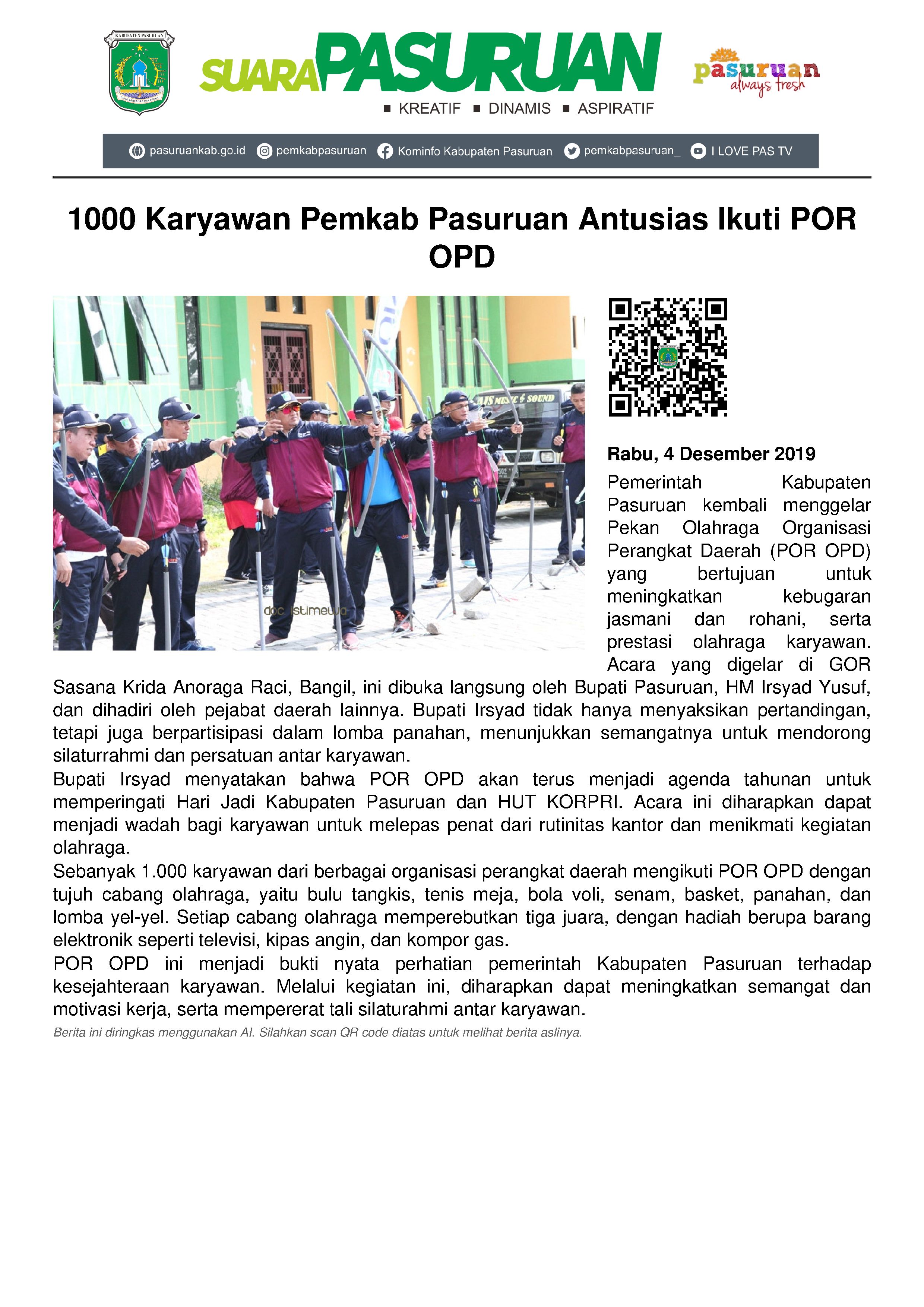 POR OPD tersebut dilaksanakan di GOR Sasana Krida Anoraga Raci, Bangil, Rabu (04/12/2019) pagi, dan dibuka langsung oleh Bupati Pasuruan, HM Irsyad Yusuf. Selain Irsyad, pembukaan acara tersebut juga dihadiri Wakil Bupati Pasuruan, KH Abdul Mujib Imron; Dandim 0819 Pasuruan, Letkol Arh Burhan Fadjari Arfian, dan undangan lainnya.