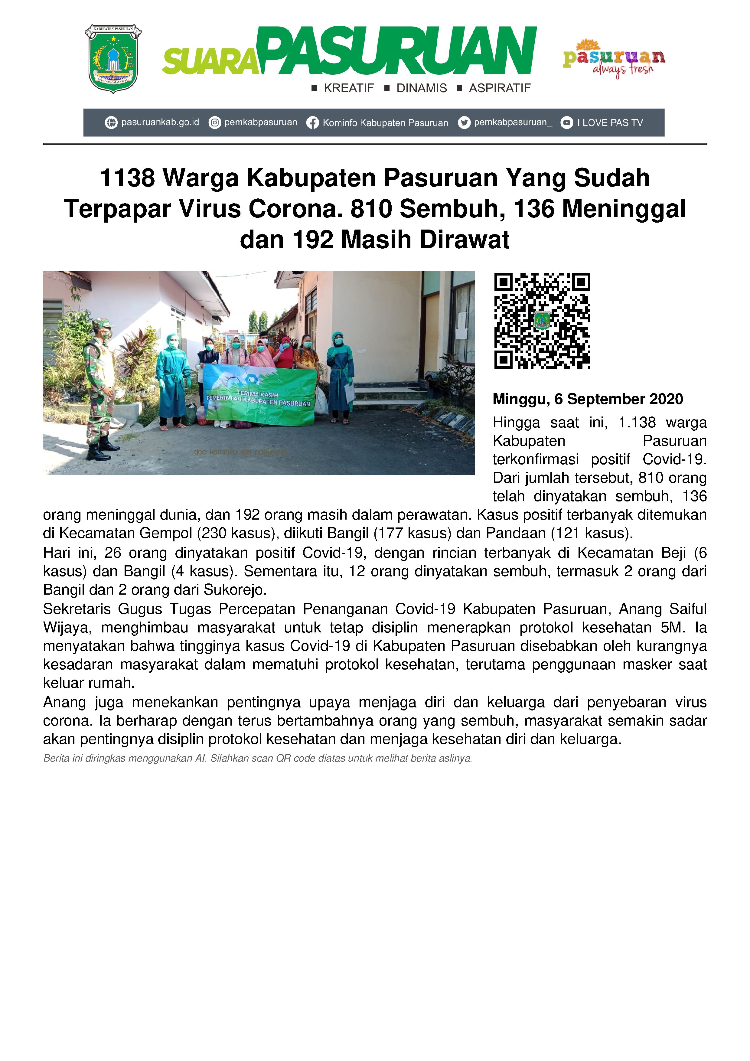 Jumlah warga Kabupaten Pasuruan yang sudah terinfeksi Virus Corona mencapai 1138 orang. Dari jumlah tersebut, sebanyak 810 orang sudah dinyatakan sembuh, 136 orang meninggal dunia, dan 192 orang masih dirawat di Rumah Sakit.