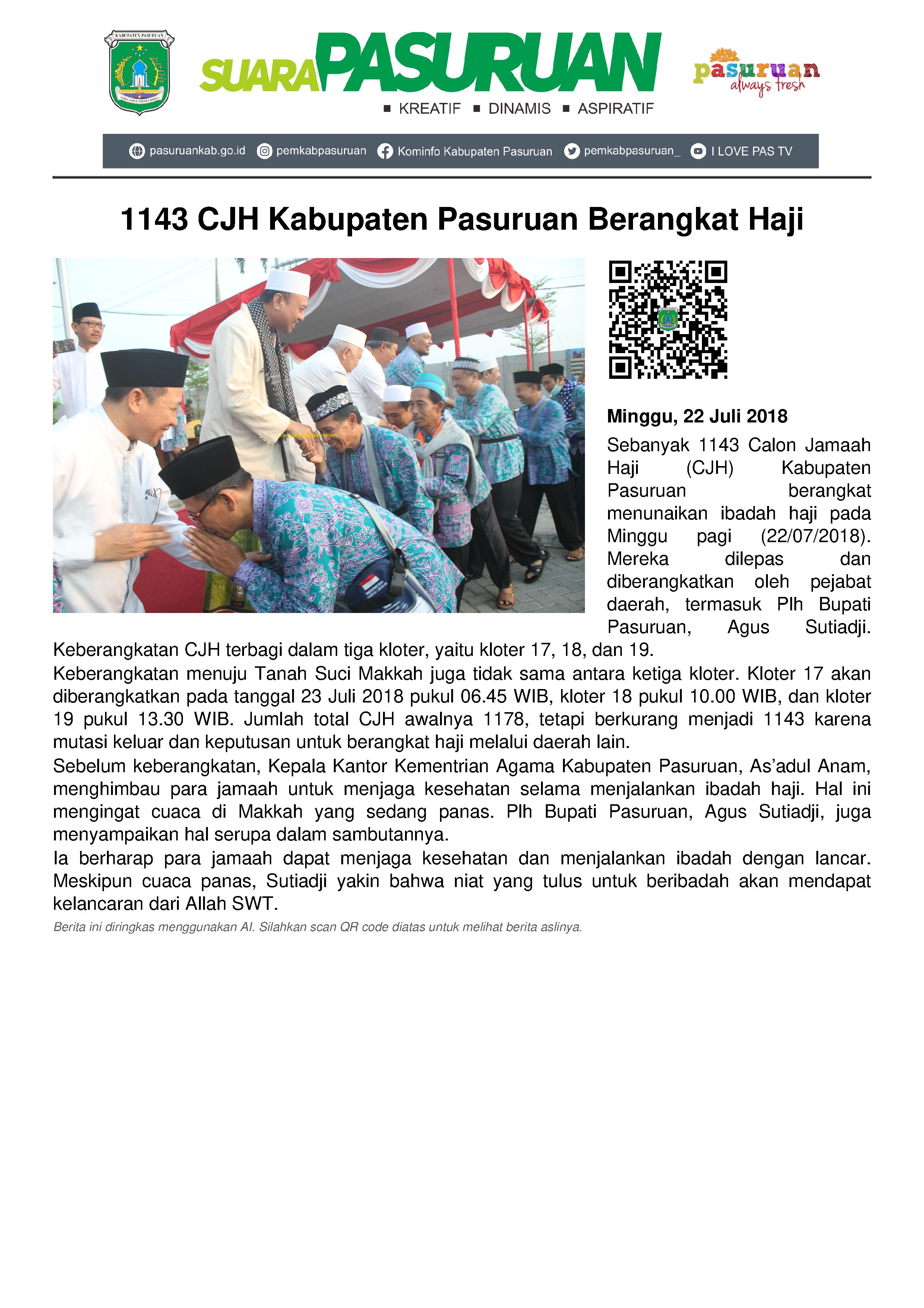 Sebanyak 1143 Calon Jamaah Haji (CJH) Kabupaten Pasuruan, berangkat menunaikan ibadah haji, Minggu (22/07/2018) pagi.