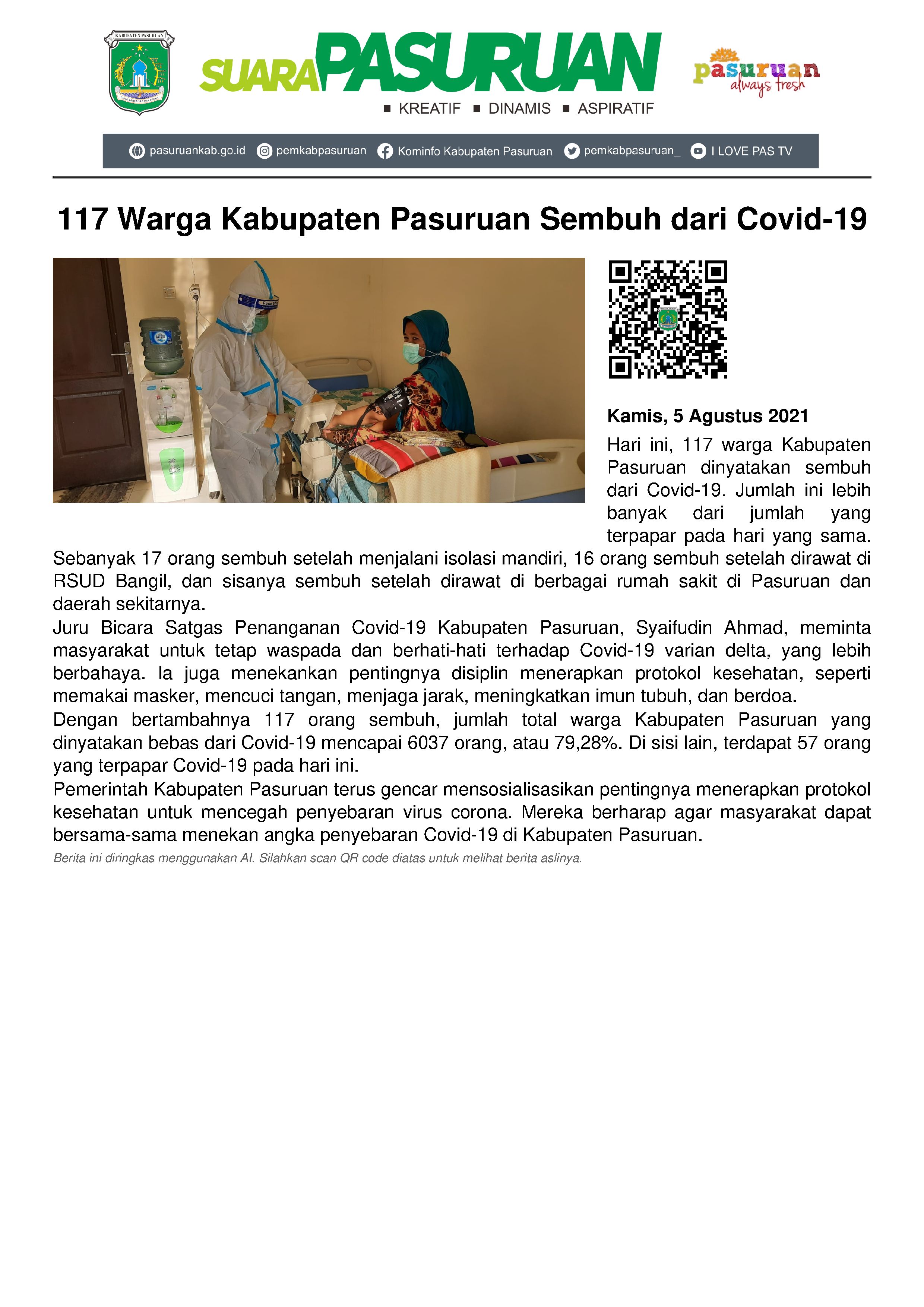 Satgas Penanganan Covid-19 Kabupaten Pasuruan mencatat, hari ini ada 117 orang yang sudah diperbolehkan beraktifitas seperti sedia kala.