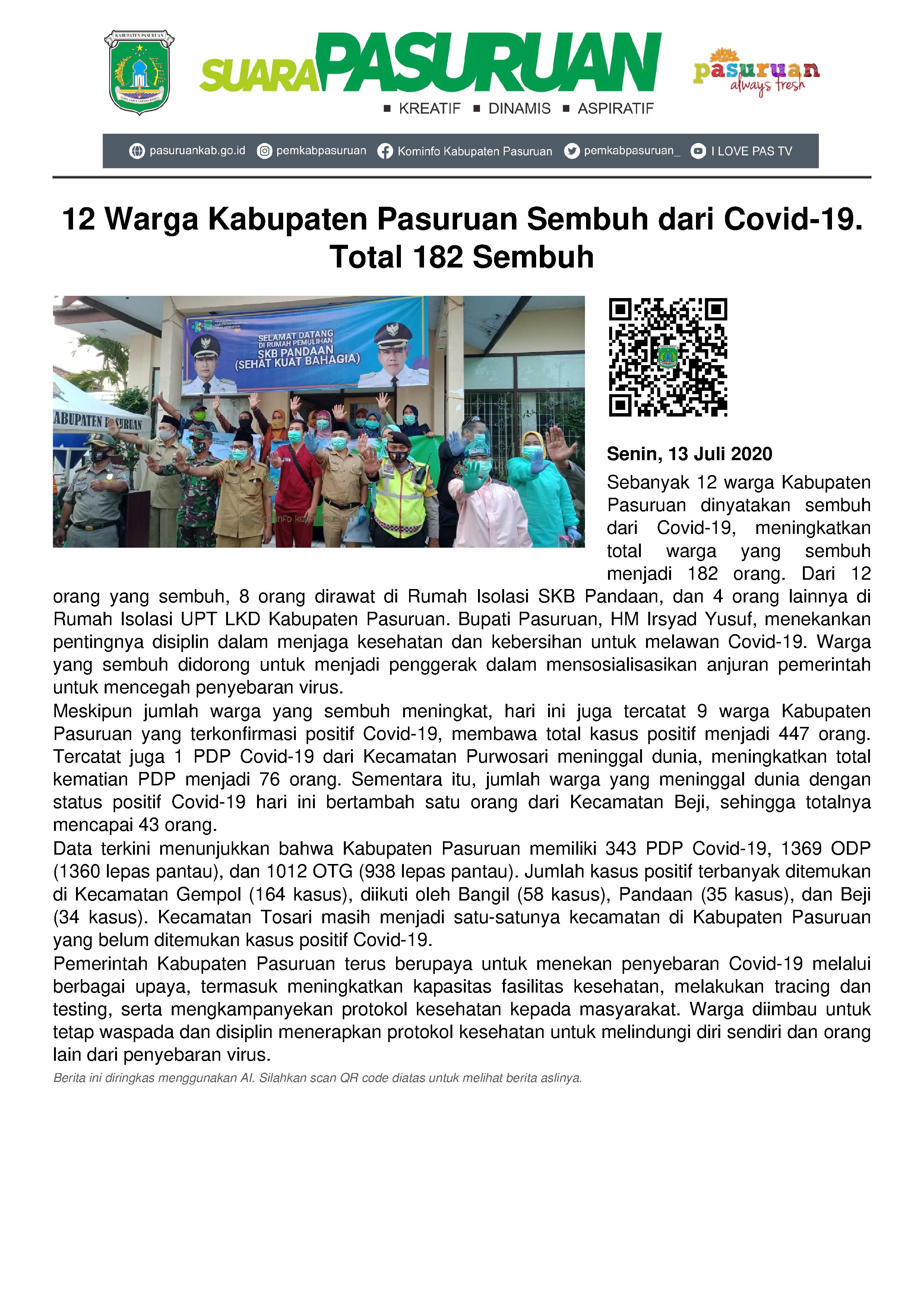 “Alhamdulillah, sore tadi Gugus Tugas Penanganan Covid-19 Kabupaten Pasuruan sudah memulangkan 12 warga Kabupaten Pasuruan yang dinyatakan sembuh dari Covid-19. Paling banyak dari Kecamatan Gempol ada 8 orang, dan sisanya dari Sukorejo, Pandaan, Purwosari dan Beji,” kata Irsyad, di sela-sela kesibukannya, Senin (13/07/2020) sore.