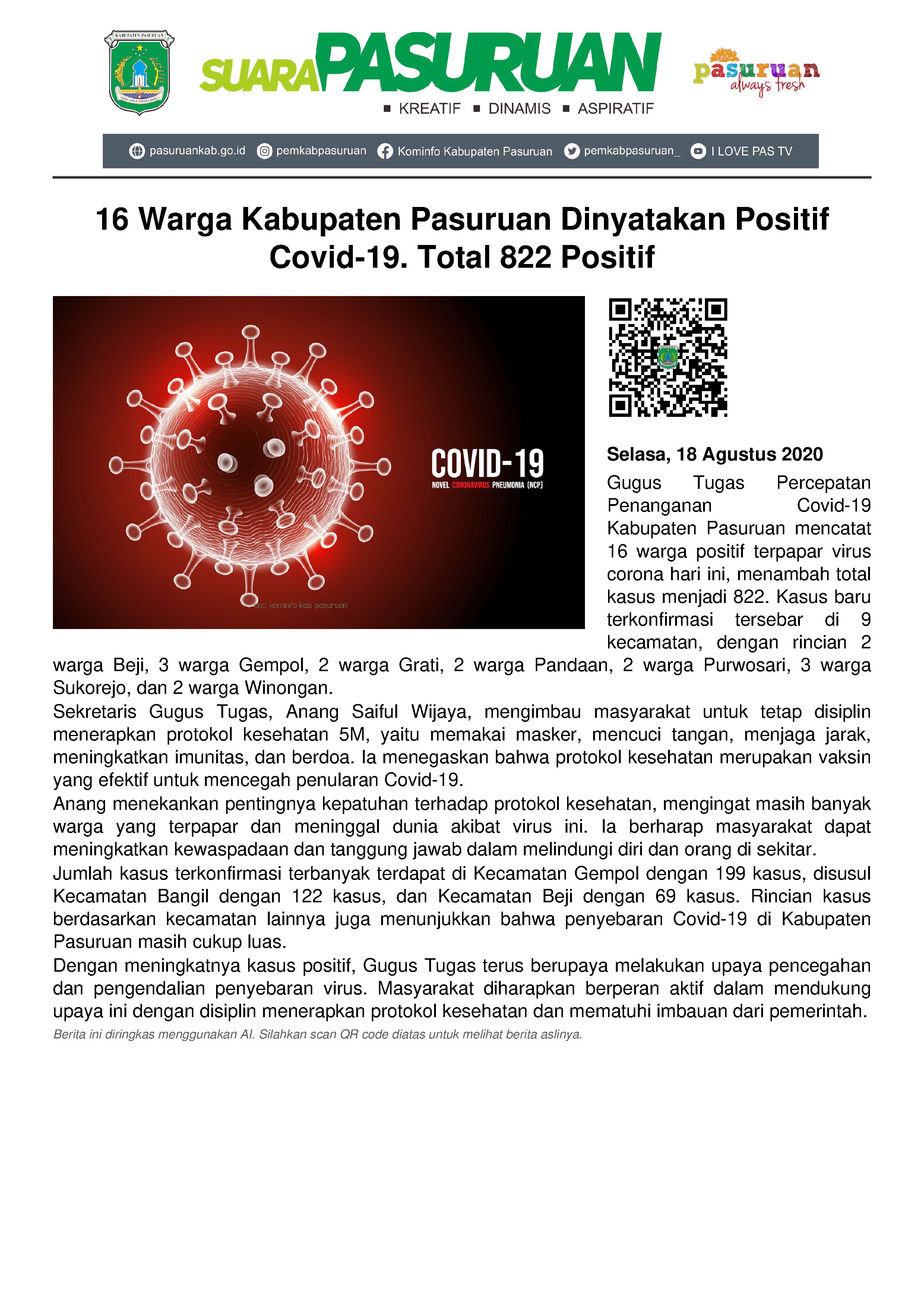 Sama dengan kemarin, Gugus Tugas Percepatan Penanganan Covid-19 Kabupaten Pasuruan mencatat ada 16 orang yang terpapar Virus Corona, hari ini.