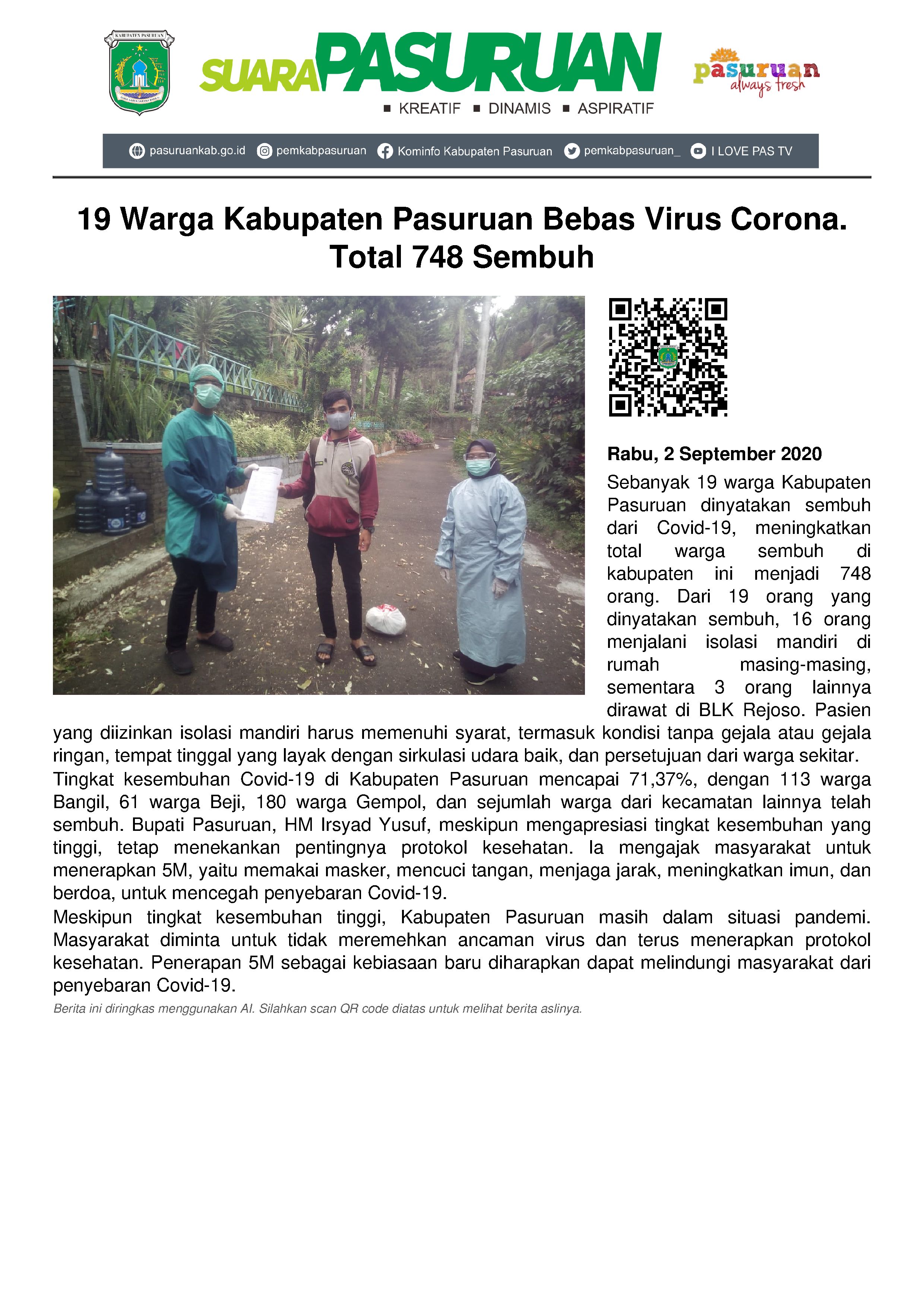 Dengan tambahan 19 orang sembuh, maka setidaknya sudah 748 warga Kabupaten Pasuruan yang sudah terbebas dari virus mematikan ini. Ketujuh ratus empat puluh delapan orang tersebut terdiri dari 113 warga Bangil, 61 warga Beji, 180 warga Gempol, 13 warga Gondangwetan, 19 warga Grati, 8 warga Kejayan, 30 warga Kraton, 10 warga Lekok, 1 warga Lumbang, 16 warga Nguling, 74 warga Pandaan, 3 warga Pasrepan, 9 warga Pohjentrek, 33 warga Prigen, 20 warga Purwodadi, 49 warga Purwosari, 7 warga Puspo, 24 warga Rejoso, 24 warga Rembang, 38 warga Sukorejo, 3 warga Tutur, 10 warga Winongan,dan 3 warga Wonorejo.