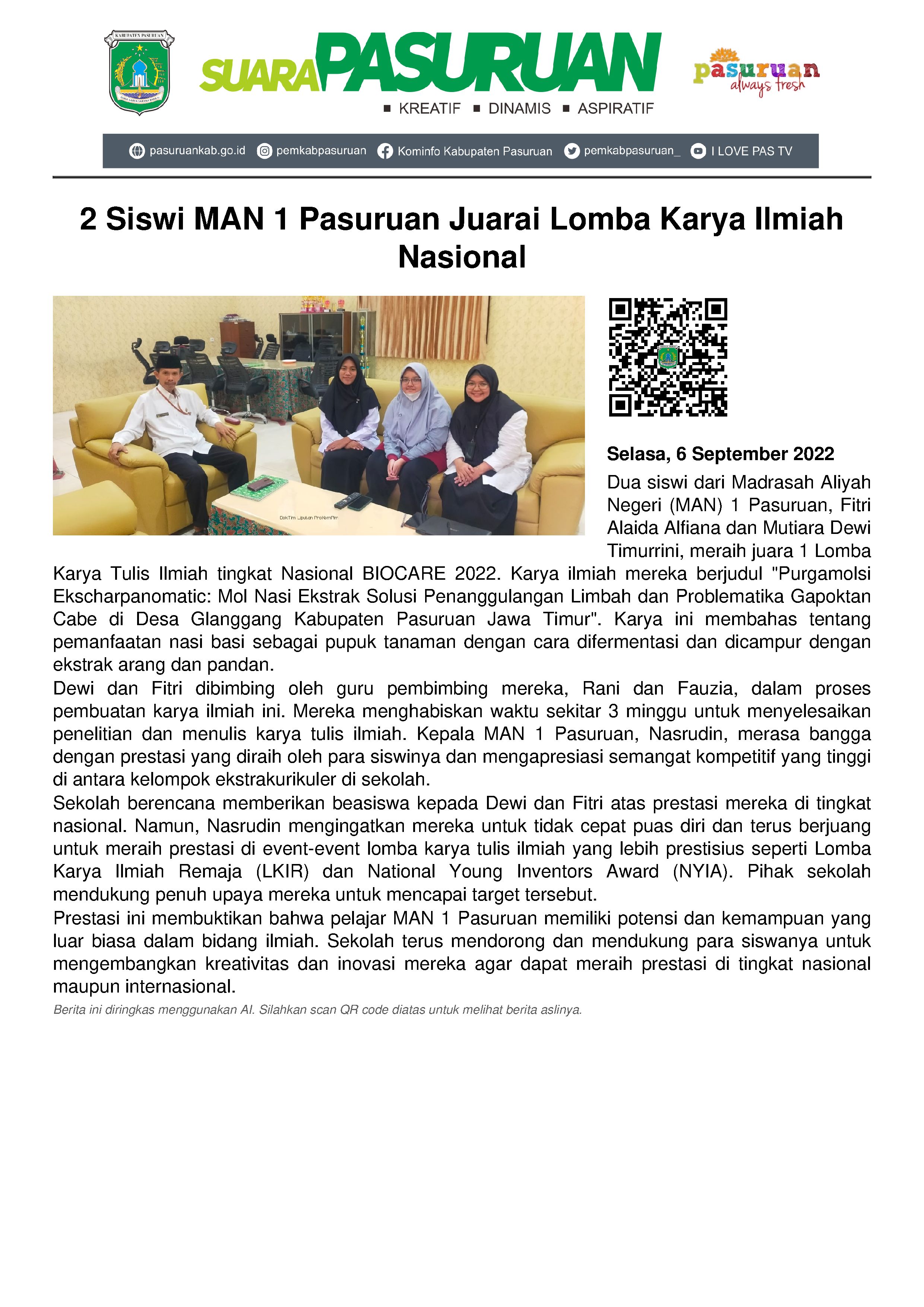Kedua siswi tersebut yakni Fitri Alaida Alfiana dari kelas XII IBB dan Mutiara Dewi Timurrini, siswi kelas XI MIA 5. Keduanya membuat karya ilmiah berjudul "Purgamolsi Ekscharpanomatic: Mol Nasi Ekstrak Solusi Penanggulangan Limbah dan Problematika Gapoktan Cabe di Desa Glanggang Kabupaten Pasuruan Jawa Timur".