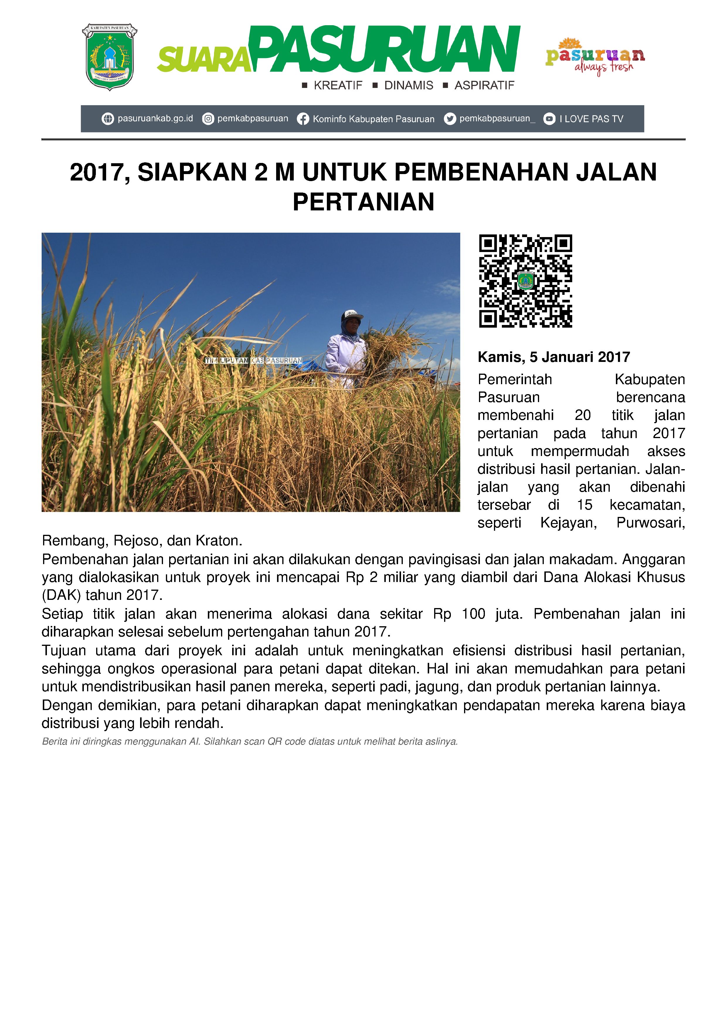 Ichwan, Kepala Dinas Pertanian Kabupaten Pasuruan mengatakan, 20 titik jalan tersebut tersebar di 15 kecamatan, diantaranya Kejayan, Purwosari, Rembang, Rejoso, Kraton dan sejumlah titik lainnya. Anggaran nya pun akan diambil dari DAK tahun 2017 dengan nilai mencapai Rp 2 Milyar.