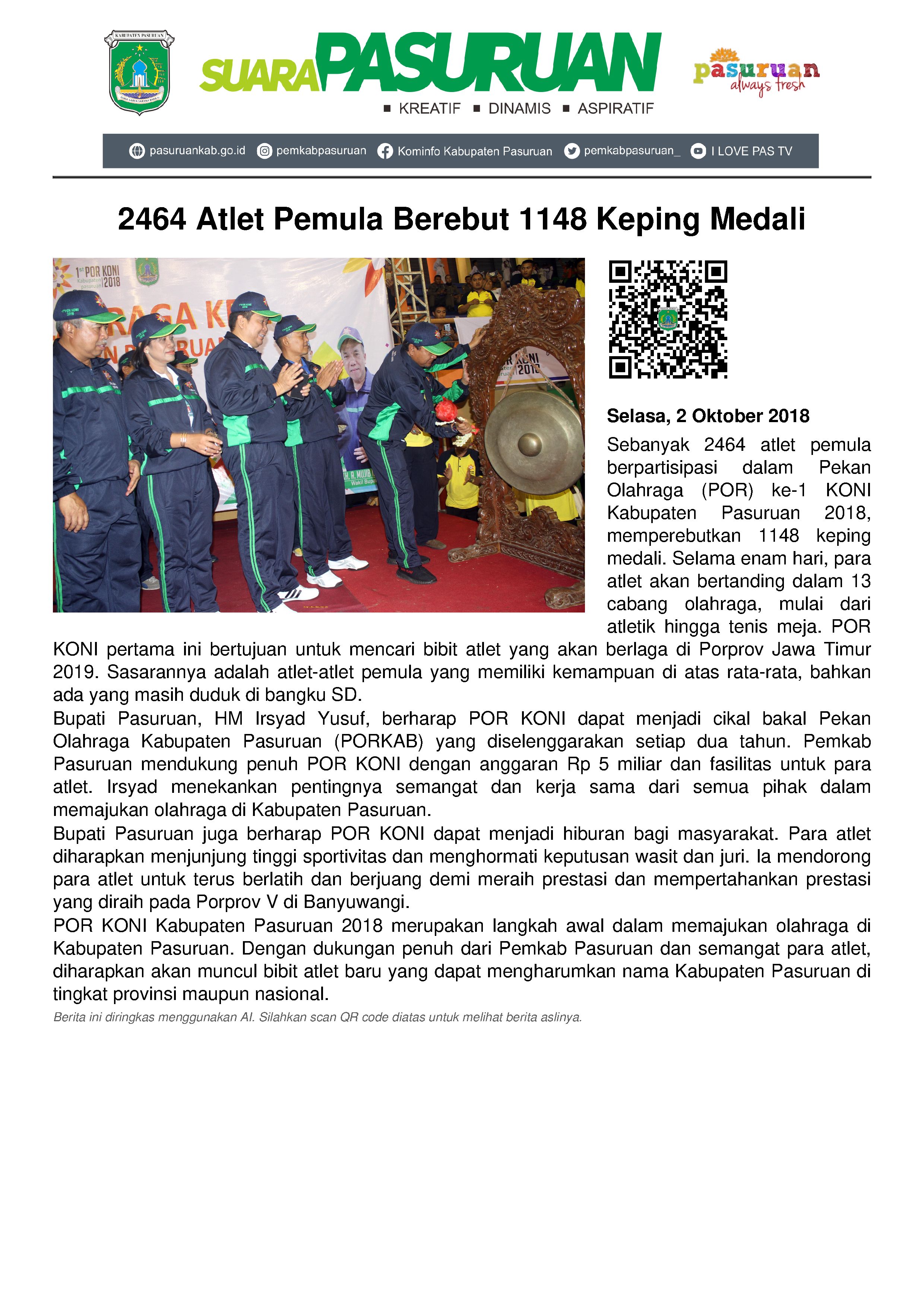 Sebanyak 2464 atlet pemula berebut 1148 keping medali dalam POR (Pekan Olahraga) ke-1 KONI Kabupaten Pasuruan 2018.