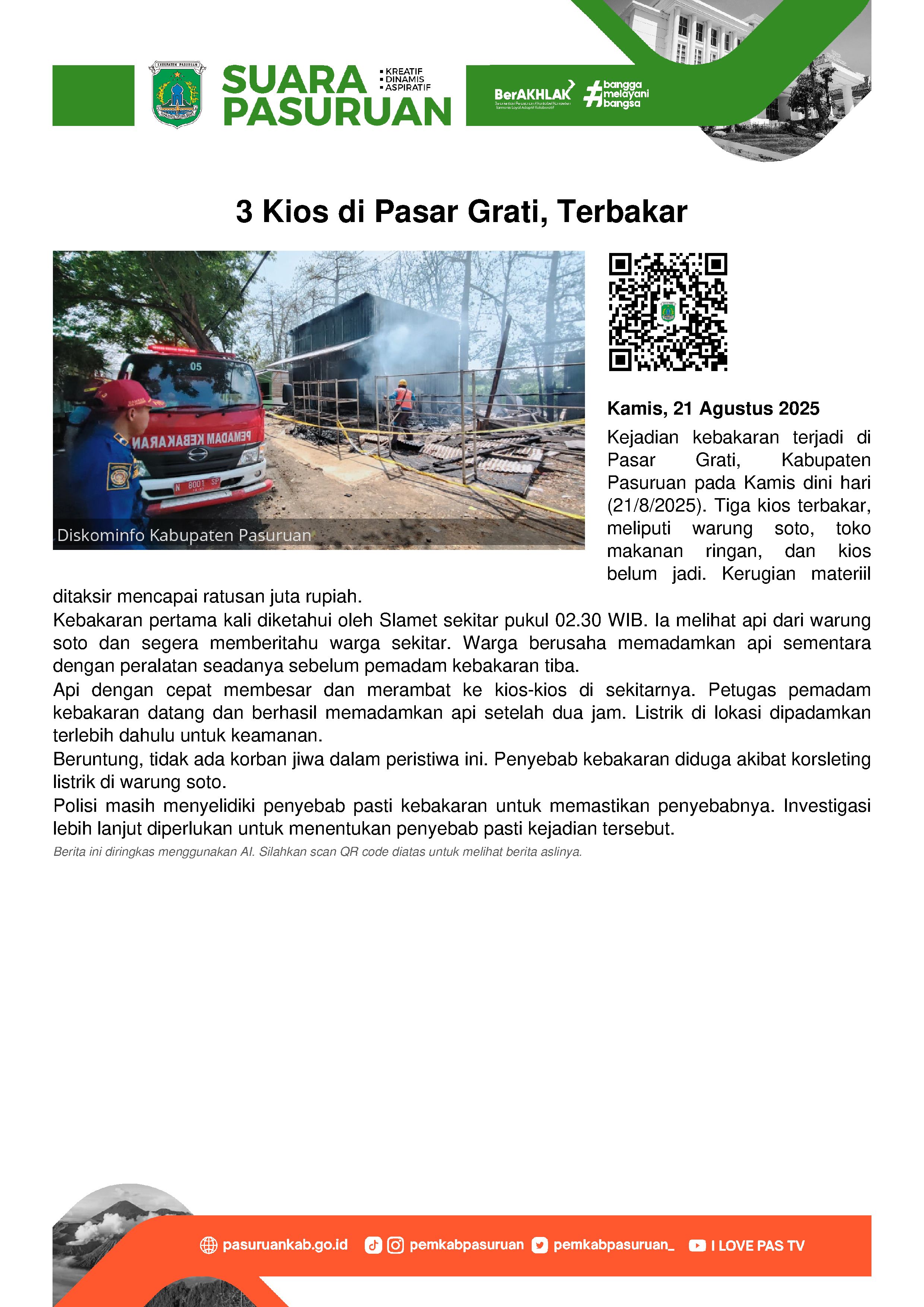 Beruntung, tidak ada korban jiwa dalam kejadian kebakaran di Pasar Grati. Namun, kerugian materiil ditaksir mencapai ratusan juta rupiah. Perihal penyebab kebakaran, diduga akibat korsleting listrik dari warung soto. Namun untuk kepastiannya, hingga kini masih diselidiki. (emil)