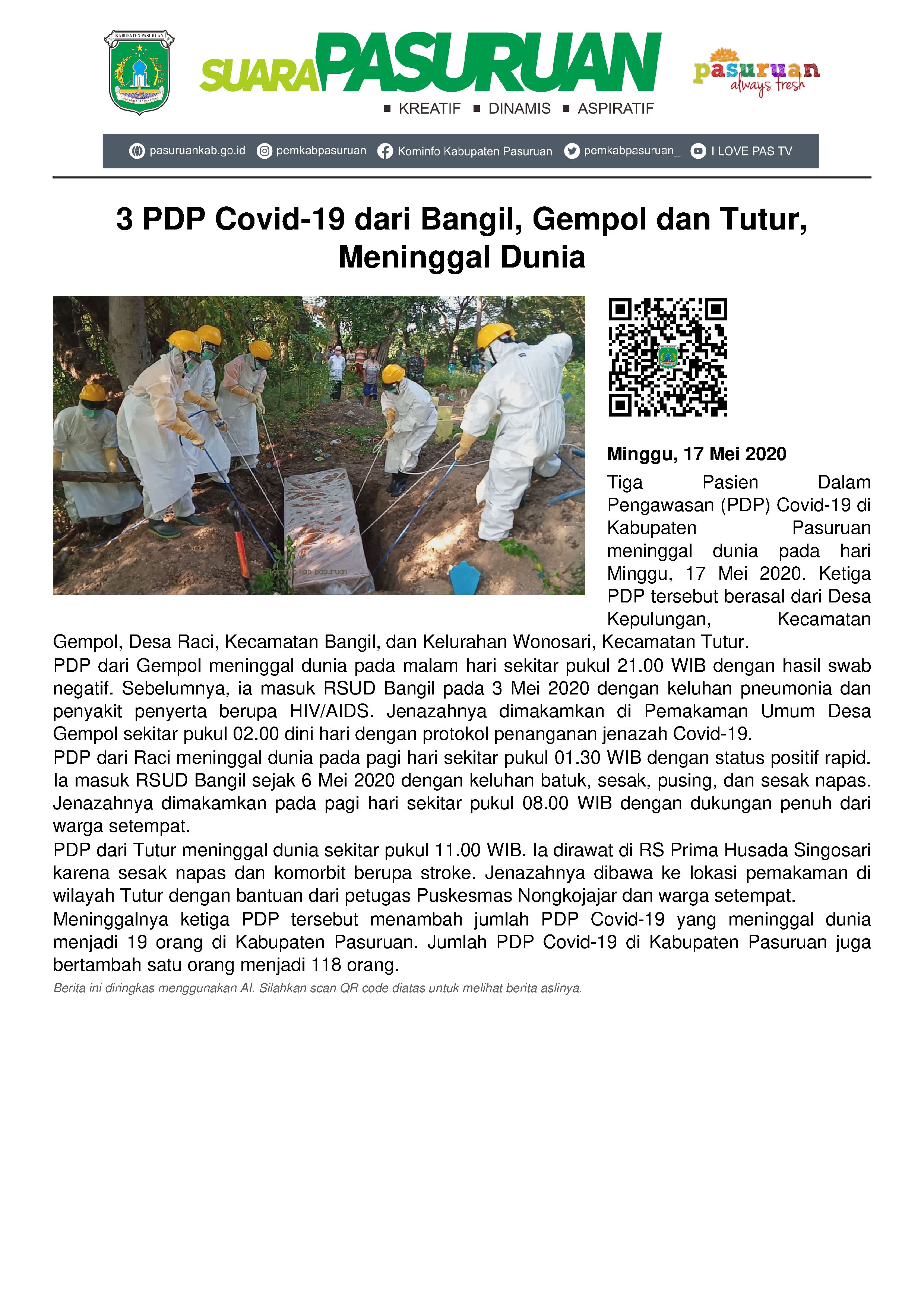Meninggalnya 3 PDP Covid-19 hari ini, menjadikan jumlah PDP Covid-19 yang meninggal sampai sore ini mencapai 19 orang. Terdiri dari 1 warga Bangil, 1 warga Gondangwetan, 2 warga Lumbang, 1 warga Lekok, 2 warga Prigen, 3 warga Wonorejo, 1 warga Purwosari, 1 warga Grati, 2 warga Gempol, 1 warga Purwodadi dan 1 warga Kraton.