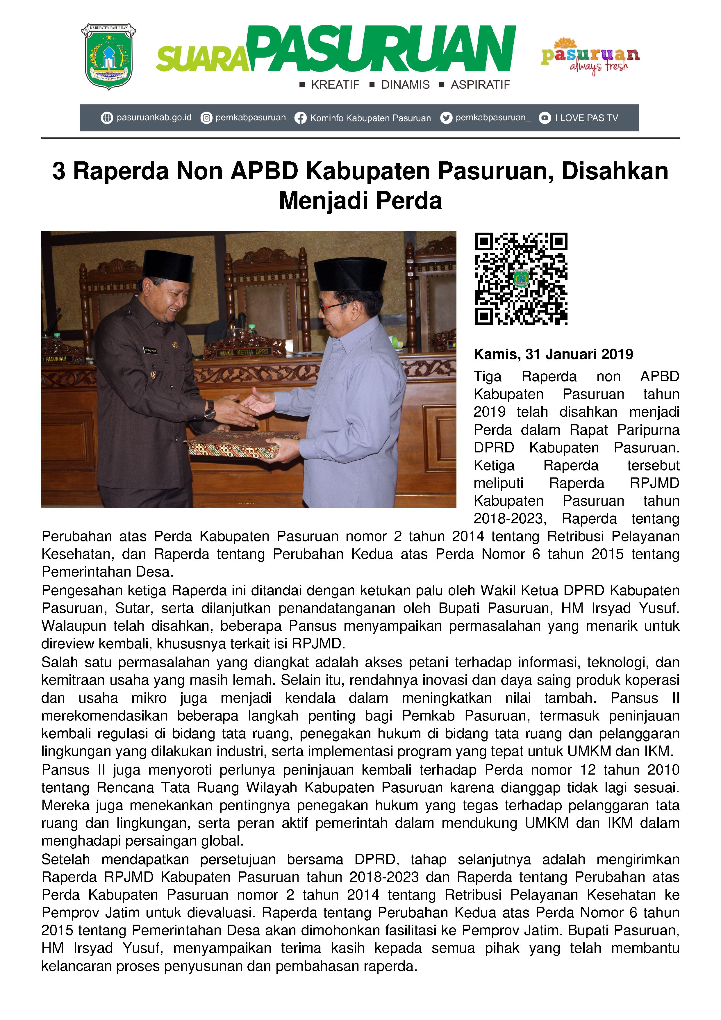 Tiga raperda yang disahkan diantaranya Raperda RPJMD Kabupaten Pasuruan tahun 2018-2023 dan Raperda tentang Perubahan atas Perda Kabupaten Pasuruan nomor 2 tahun 2014 tentang Retribusi Pelayanan Kesehatan di UPTD Kesehatan Puskesmas dan UPTD Kesehatan Laboratorium Kesehatan Daerah, serta Raperda tentang Perubahan Kedua atas Perda Nomor 6 tahun 2015 tentang Pemerintahan Desa.