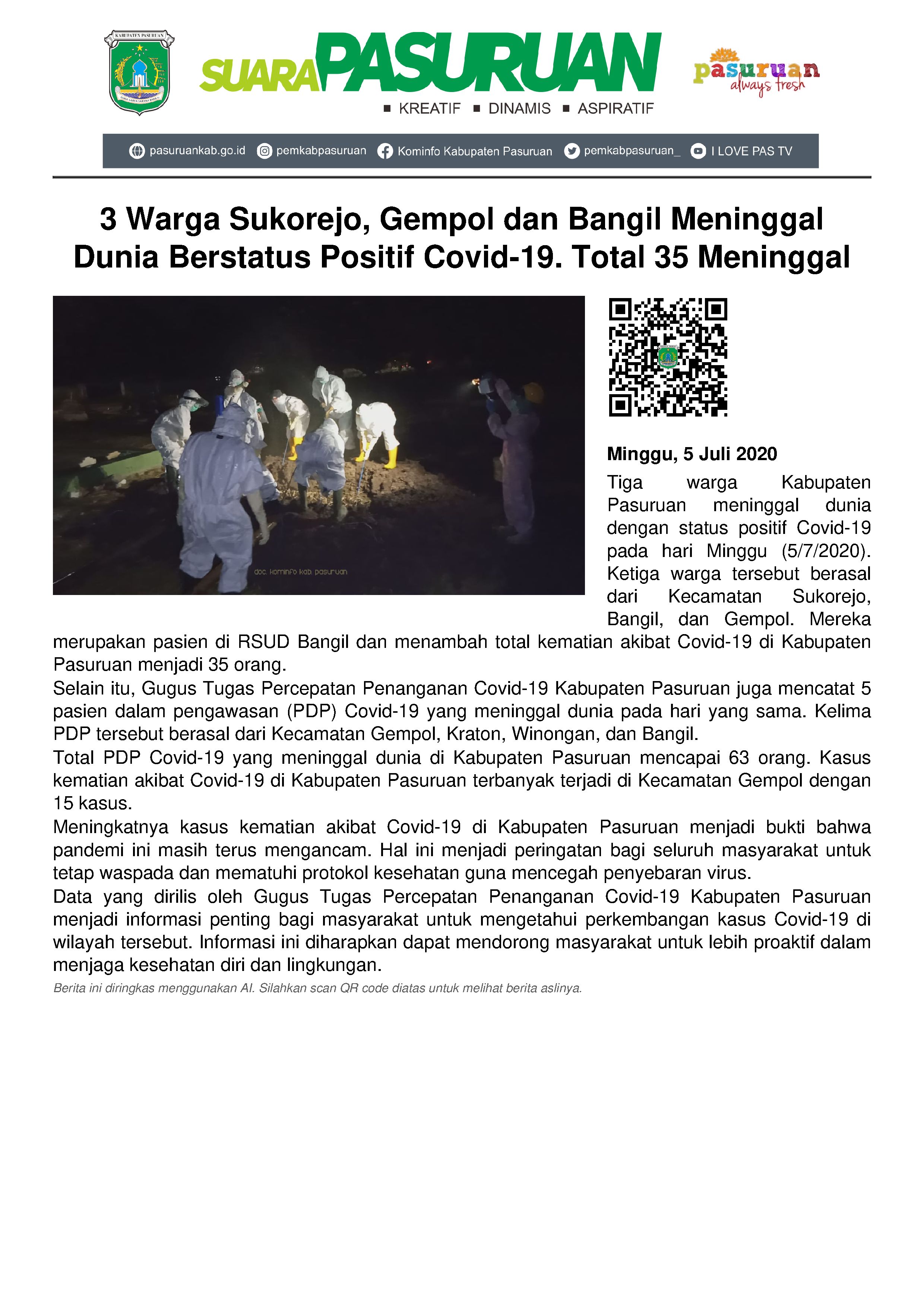 Meninggalnya 3 pasien positif covid-19 yang meninggal dunia hari ini, menambah jumlah keseluruhan se-Kabupaten Pasuruan mencapai 35 orang. Dengan rincian 3 warga Bangil, 2 warga Beji, 15 warga Gempol, 1 warga Kejayan, 4 warga Pandaan, 1 warga Pohjentrek, 1 warga Prigen, 1 warga Purwodadi, 1 warga Purwosari, 1 warga Sukorejo, dan 2 warga Tutur.