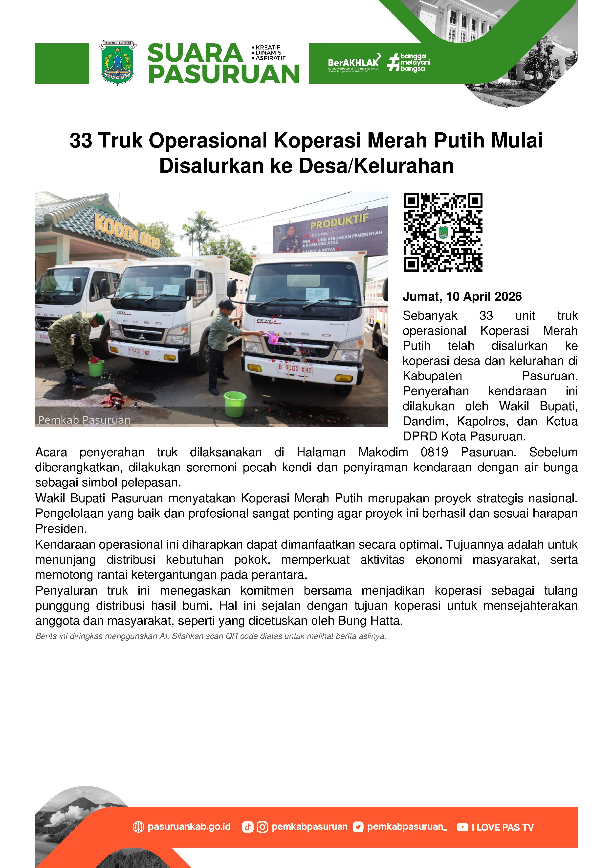Sebagai buktinya, sebanyak 33 unit truk koperasi merah putih secara resmi diserahkan dan disalurkan kepada koperasi desa dan kelurahan yang tersebar di seluruh wilayah Kabupaten Pasuruan.