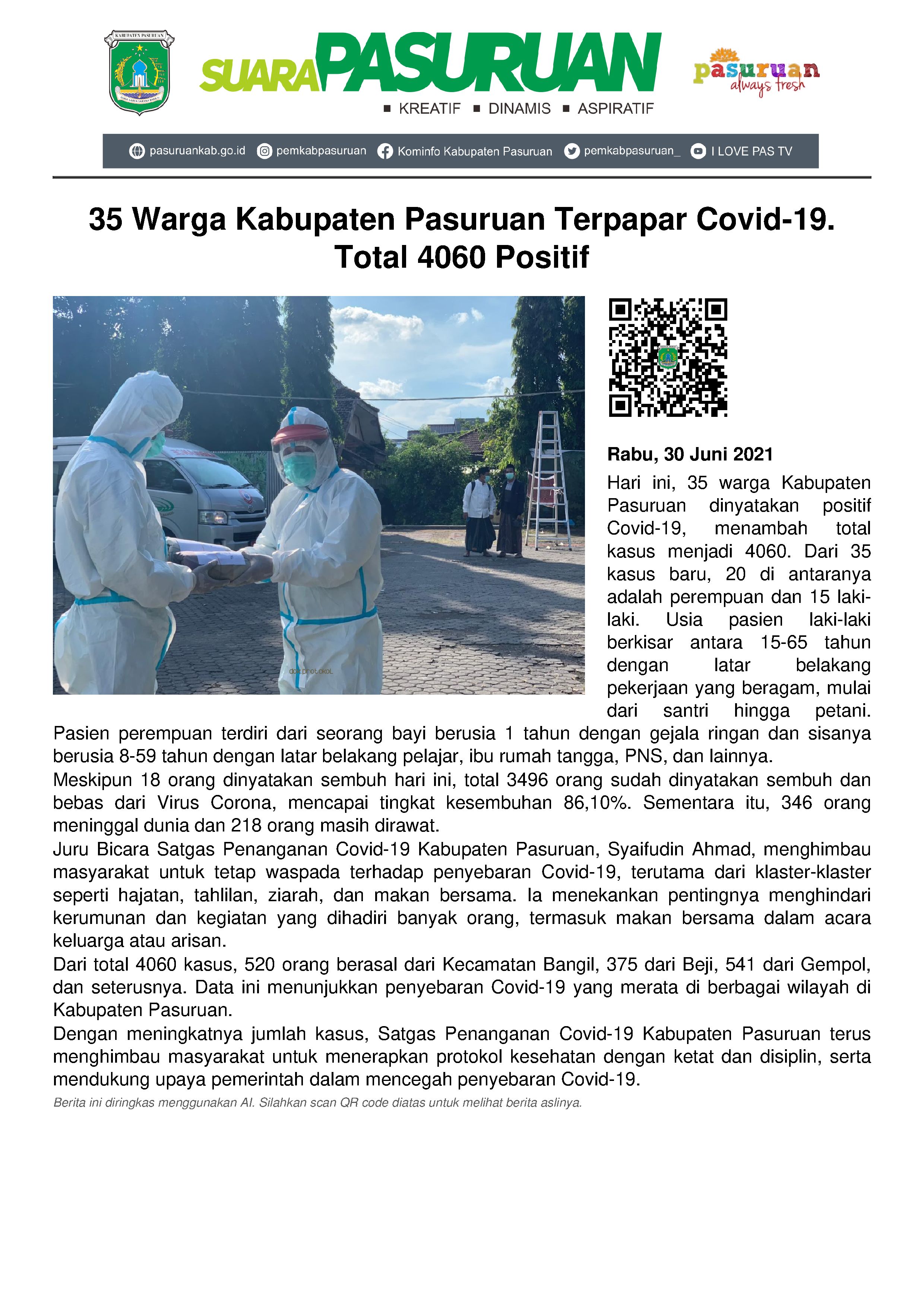 Dengan tambahan 35 orang positif, maka hingga hari ini, jumlah warga Kabupaten Pasuruan yang telah terinfeksi Virus Corona sebanyak 4060 orang.