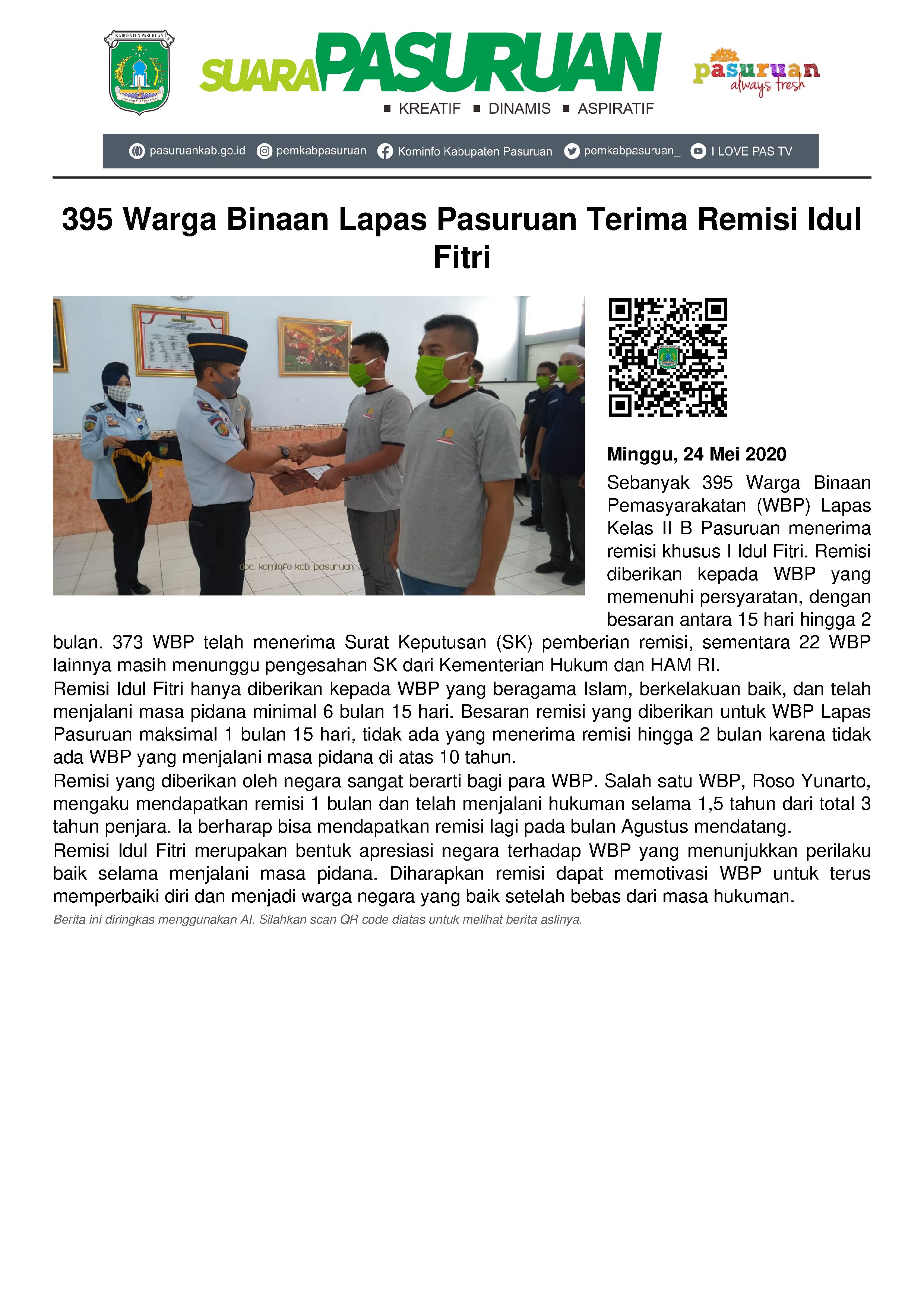 Kepala Lapas Kelas II B Pasuruan, Wahyu Indarto mengatakan, dari 395 WBP, sebanyak 373 sudah mendapatkan SK (surat keputusan) pemberian remisi Idul Fitri. Sedangkan 22 WBP lainnya segera menyusul, lantaran sebanyak 21 orang tinggal menunggu upload SK pengesahan dari Kementerian Hukum dan HAM RI, serta 1 WBP yang juga tinggal menunggu keputusan, setelah dokumen yang dikirim, masih ada kekurangan.