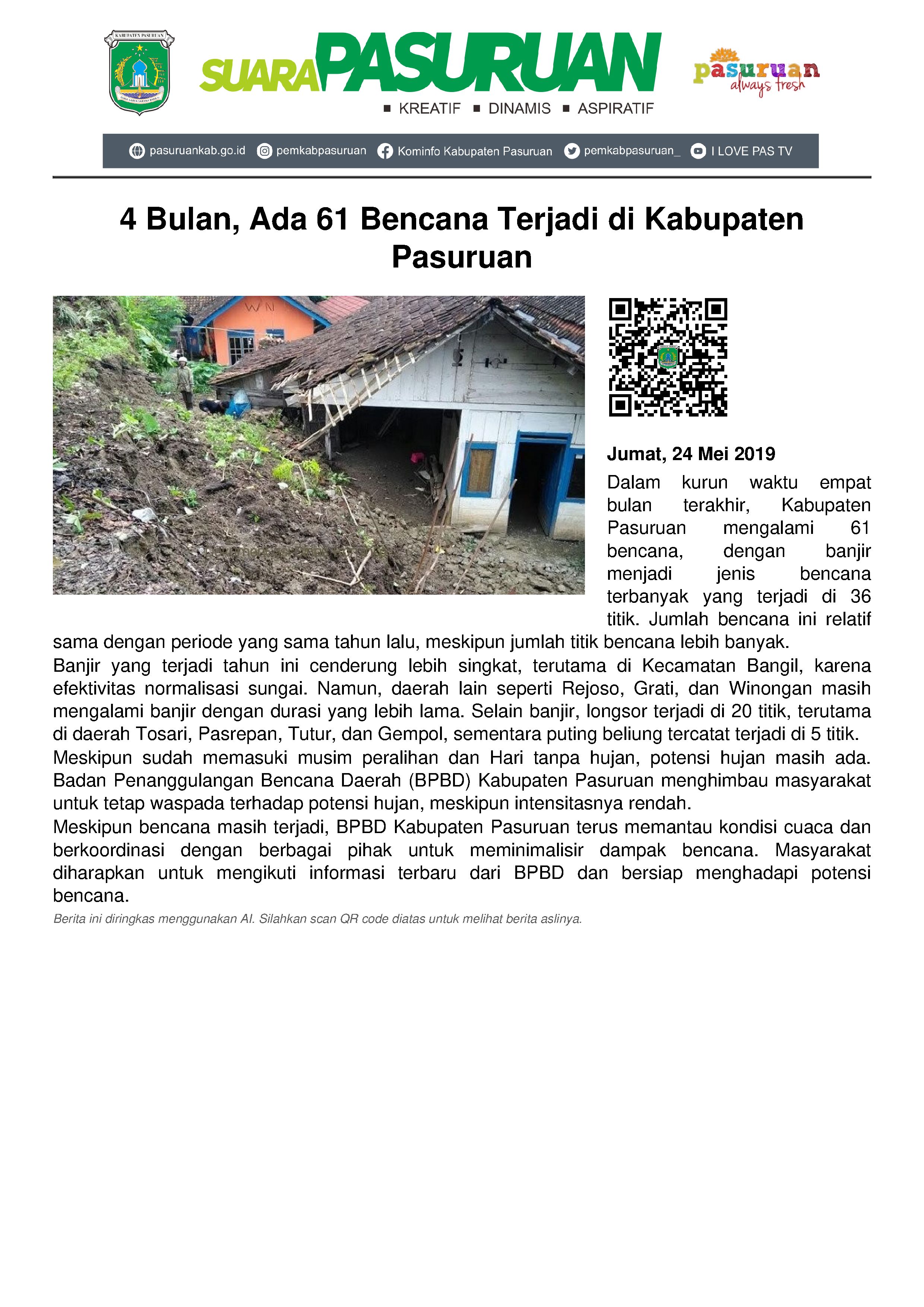 Empat bulan terakhir, Badan Penganggulangan Bencana Daerah (BPBD) Kabupaten Pasuruan mencatat ada 61 bencana yang terjadi. Paling tinggi adalah bencana banjir yang terjadi di 36 titik, baik di wilayah Tengah, Timur sampai Barat.