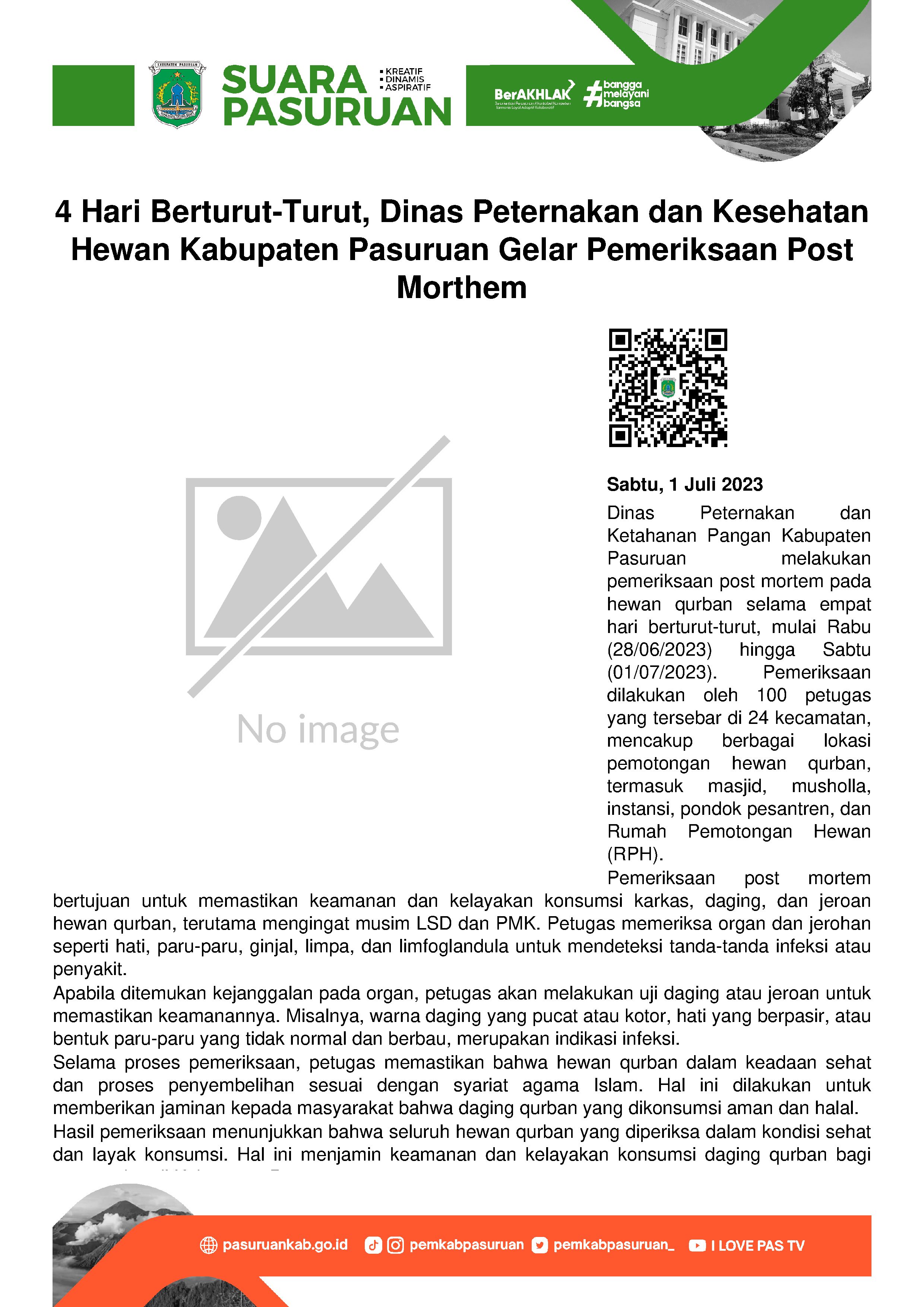 Seperti yang terlihat pada Rabu (28/06/2023) hingga Sabtu (01/07/2023) pagi. Para petugas berkeliling ke sejumlah lokasi pemotongan hewan qurban di Kabupaten Pasuruan. Baik di masjid, musholla, instansi, pondok pesantren hingga RPH (Rumah Pemotongan Hewan).