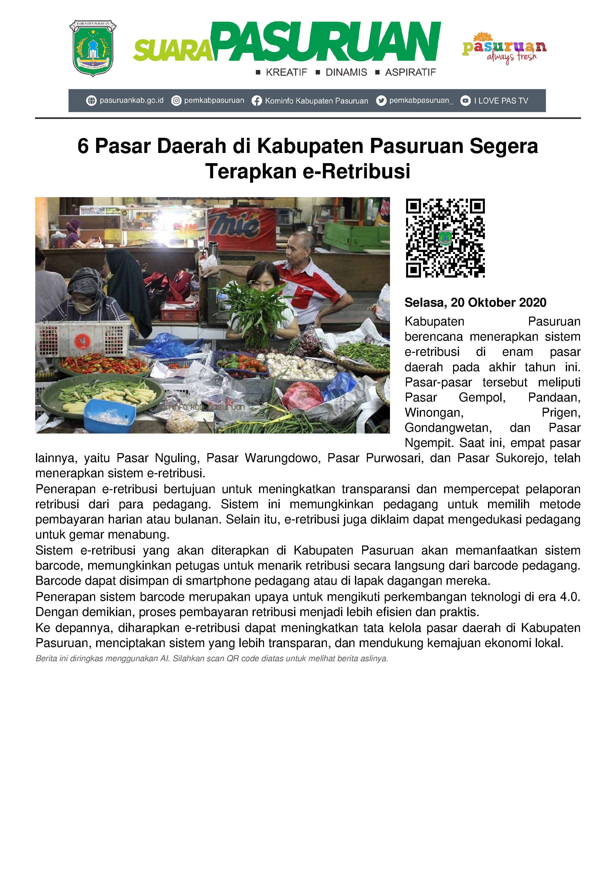 Kepala Bidang Pengelolaan Pasar Disperindag Kabupaten Pasuruan, Gatot Sutanto mengatakan, pihaknya menargetkan ada tambahan 6 pasar daerah yang bakal menerapkan penarikan e-retribusi.