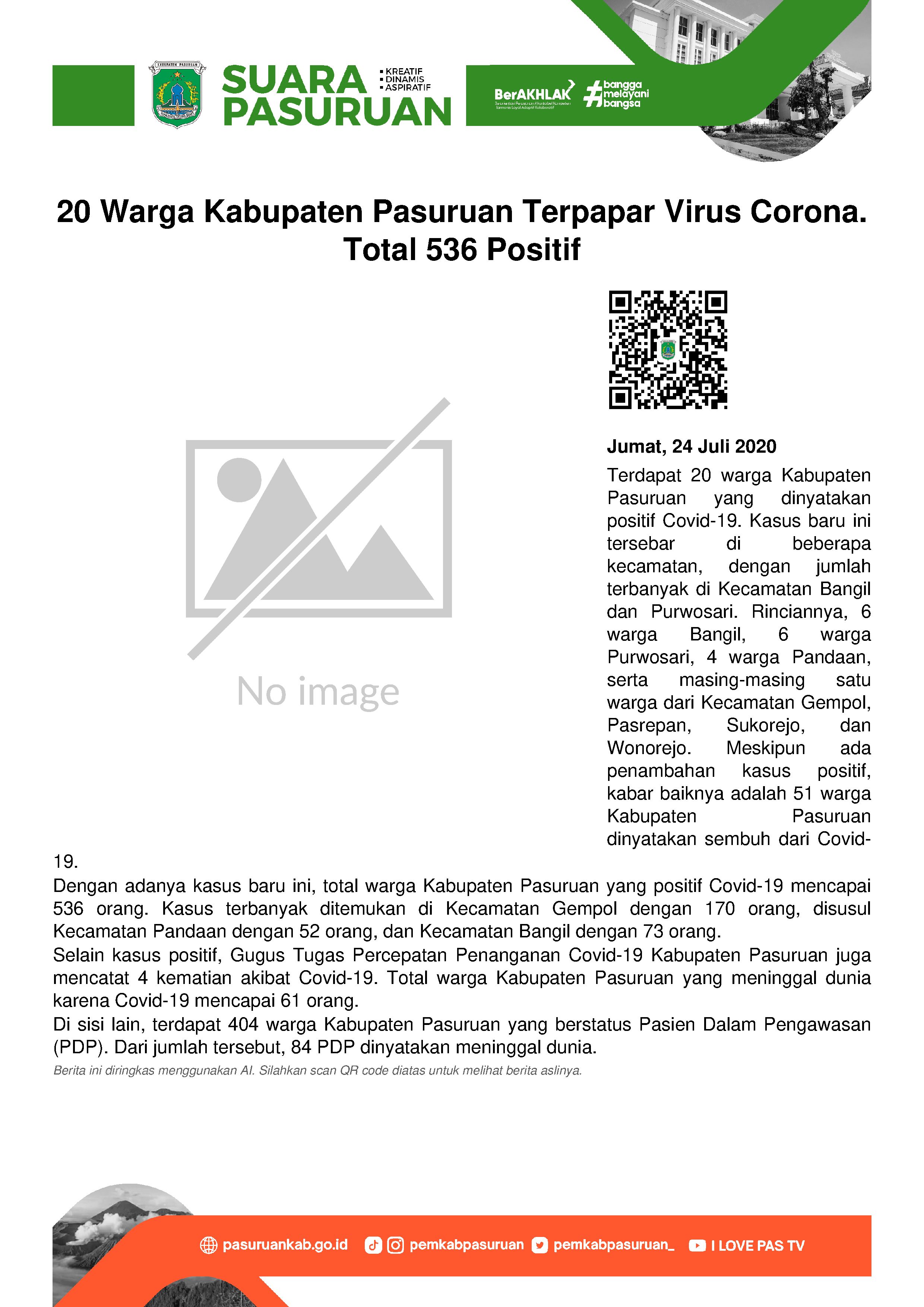 Dengan bertambahnya sembilan orang terpapar virus corona, maka jumlah warga Kabupaten Pasuruan yang dinyatakan Positif Covid-19 mencapai 560 orang. Dengan rincian 82 warga Bangil, 44 warga Beji, 172 warga Gempol, 9 warga Gondangwetan, 13 warga Grati, 18 warga Kraton, 8 warga Lekok, 1 warga Lumbang, 11 warga Nguling, 53 warga Pandaan, 3 warga Pasrepan, 8 warga Pohjentrek, 25 warga Prigen, 15 warga Purwodadi, 31 warga Purwosari, 5 warga Puspo, 10 warga Rejoso, 3 warga Kejayan, 15 warga Rembang, 23 warga Sukorejo, 3 warga Tutur, 6 warga Winongan dan 2 warga Wonorejo.