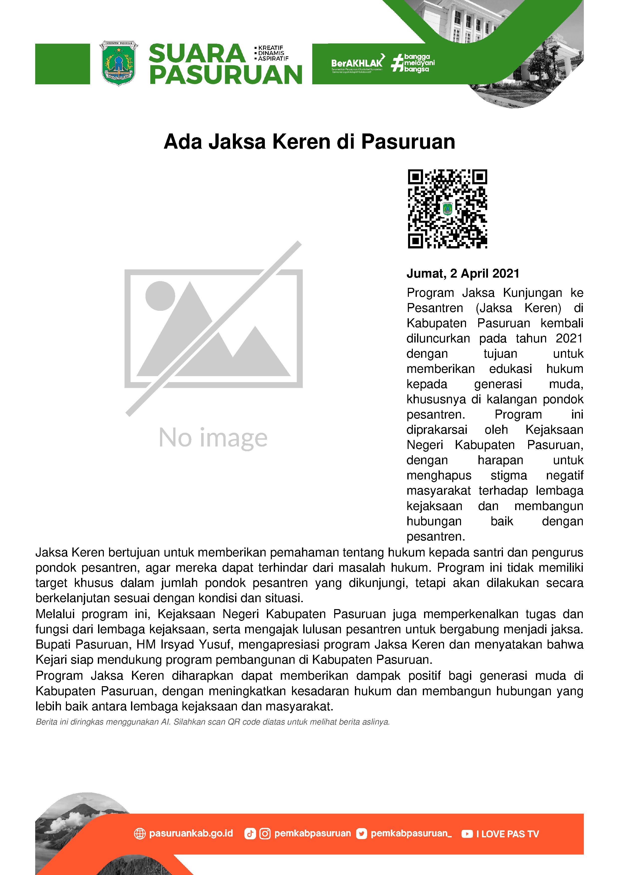 Program ini kembali dimulai pada tahun 2021, dan dibuka secara langsung oleh Bupati Pasuruan, HM Irsyad Yusuf bersama Kepala Kejaksaan Negeri (Kajari) Kabupaten Pasuruan, Ramdhanu Dwiyantoro, di Aula Ponpes Al Yasini, Areng-Areng Wonorejo, Kamis (01/04/2021).