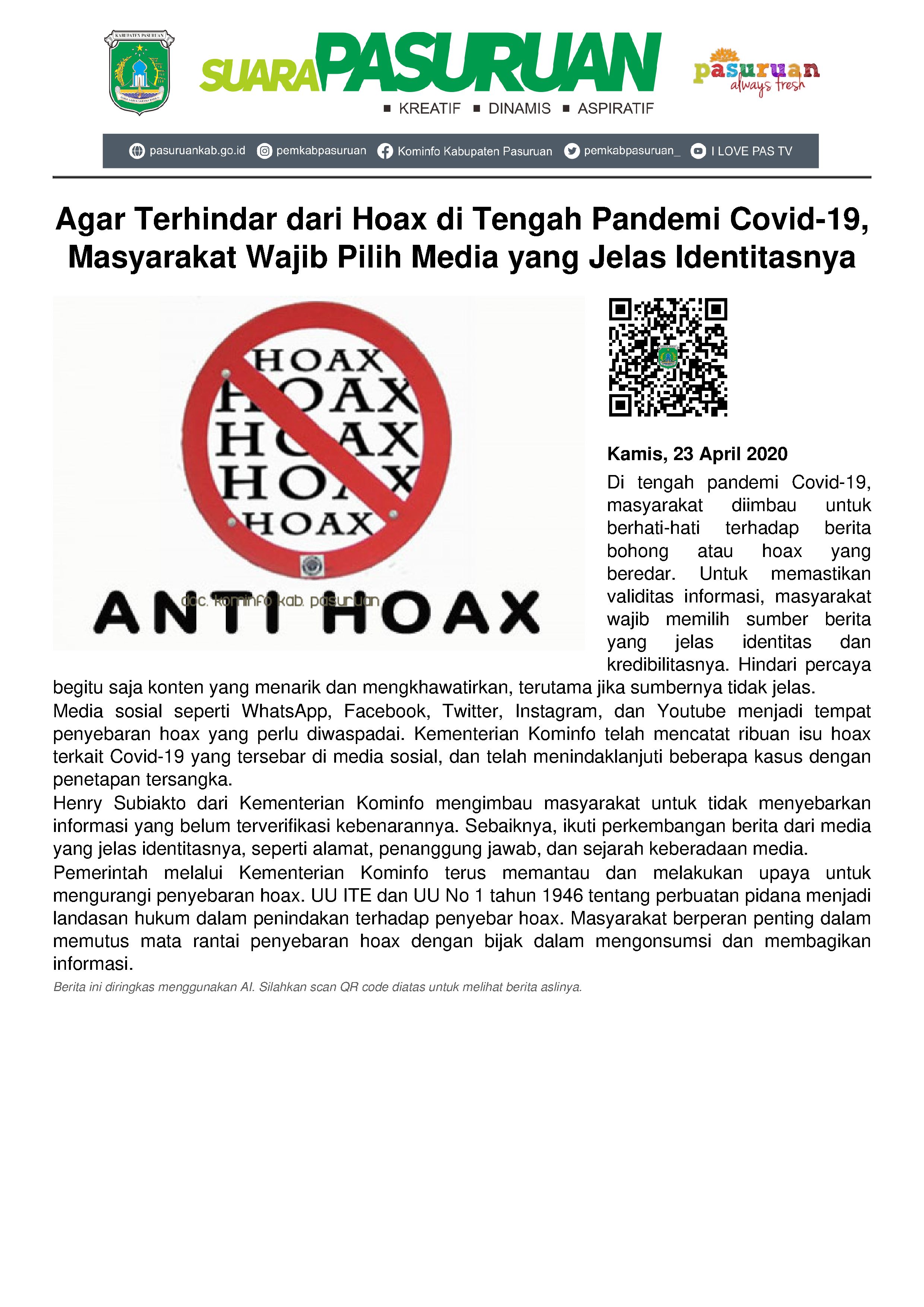 Untuk memastikan validitas konten berita, masyarakat wajib memastikan sumber berita yang benar-benar terpercaya. Baik secara kelembagaan maupun kredibilitas media yang bersangkutan. Hal tersebut disampaikan Staf Ahli Bidang Hukum, Kementerian Komunikasi dan Informatika (Kominfo), Henry Subiakto menyikapi masih tingginya peredaran hoax di tanah air di tengah pandemi Covid-19 saat ini.