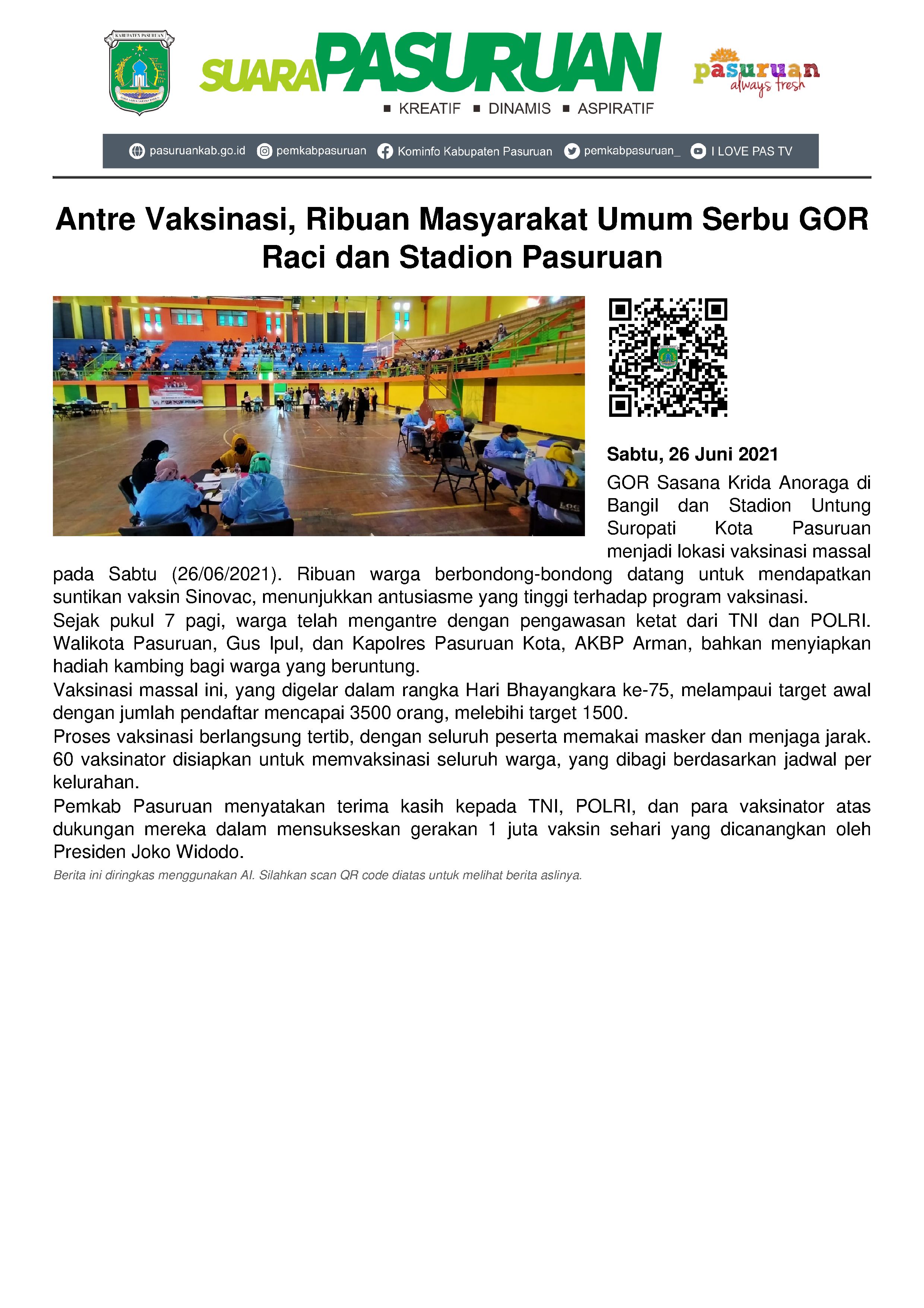 GOR Sasana Krida Anoraga di Bangil dan Stadion Untung Suropati Kota Pasuruan disulap menjadi lokasi Vaksinasi Massal, Sabtu (26/06/2021) pagi.