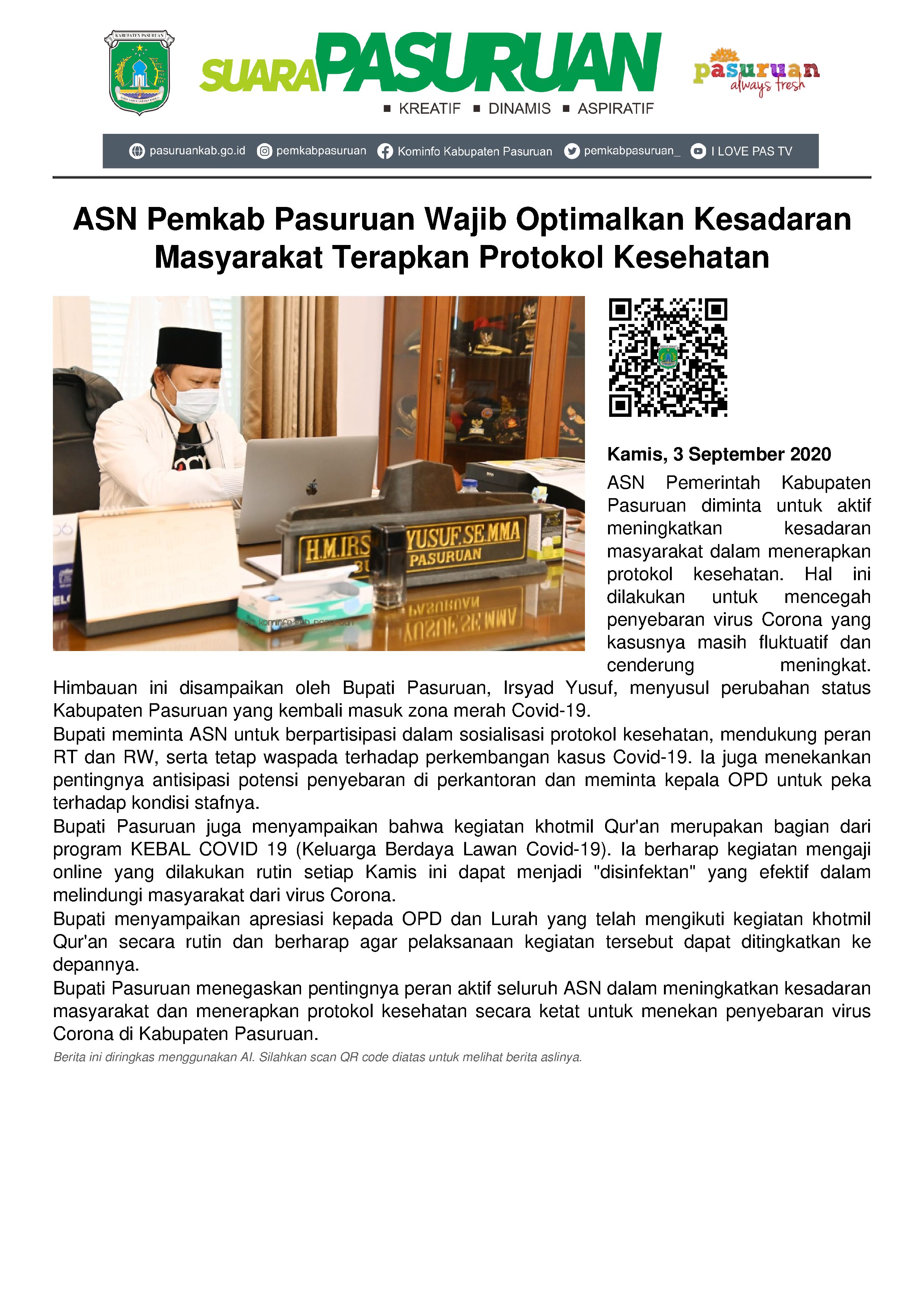 Seluruh Aparatur Sipil Negara (ASN) Pemerintah Kabupaten Pasuruan harus bersama-sama berpartisipasi aktif mengoptimalkan kesadaran masyarakat dalam menerapkan protokol kesehatan. Sehingga bisa melakukan upaya preventif, mengantisipasi potensi penyebaran virus Corona yang sampai saat ini kasusnya masih fluktuatif, bahkan cenderung naik. Himbauan ini disampaikan Bupati Pasuruan, Irsyad Yusuf setelah pelaksanaan Khotmil Qur’an pagi tadi, Kamis (3/9/2020).