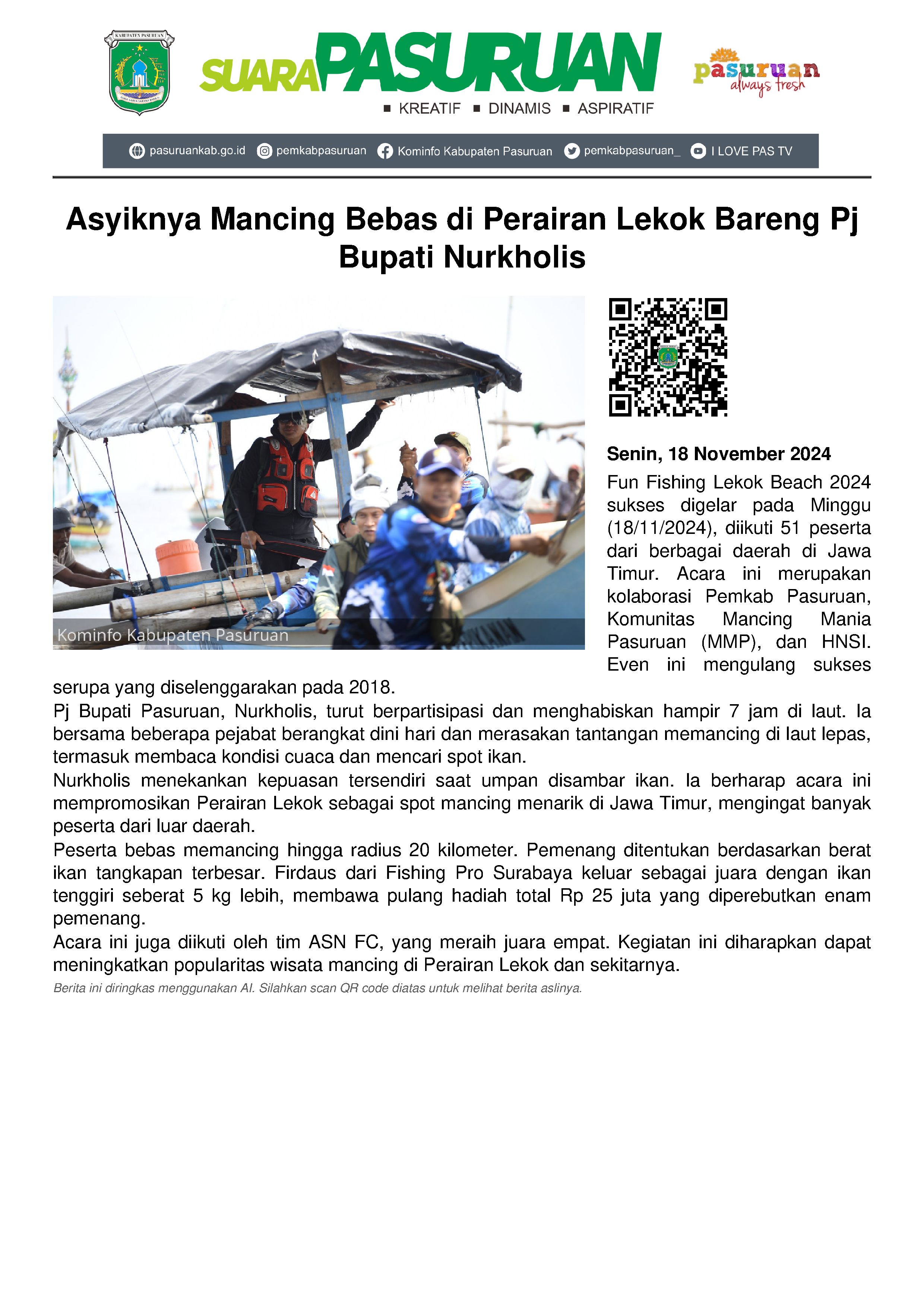 Dengan digelarnya Fun Fishing Lekok Beach 2024, Nurkholis berharap Perairan Lekok semakin dikenal sebagai salah satu spot mancing menarik di Jawa Timur.