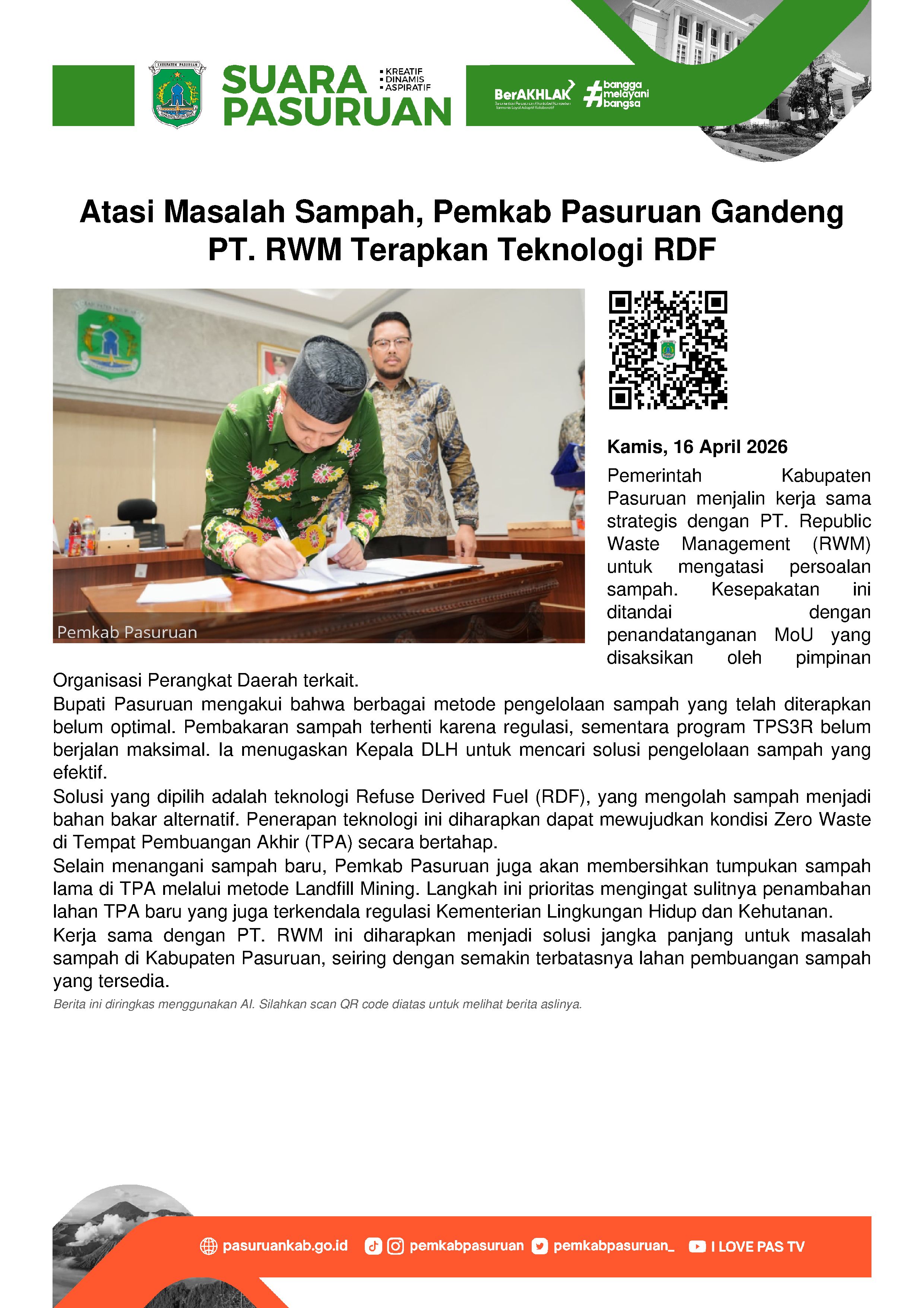 Pemerintah Kabupaten Pasuruan secara resmi menjalin kerja sama strategis dengan PT. Republic Waste Management (RWM) untuk mengatasi persoalan persampahan yang terus berkembang. Kerja sama ini ditandai dengan penandatanganan kesepakatan bersama atau Memorandum of Understanding (MoU) yang disaksikan oleh sejumlah pimpinan Organisasi Perangkat Daerah (OPD) terkait di ruang rapat Dinasti Isyana, Kantor Bupati Pasuruan, Kamis (16/4/2026) siang.