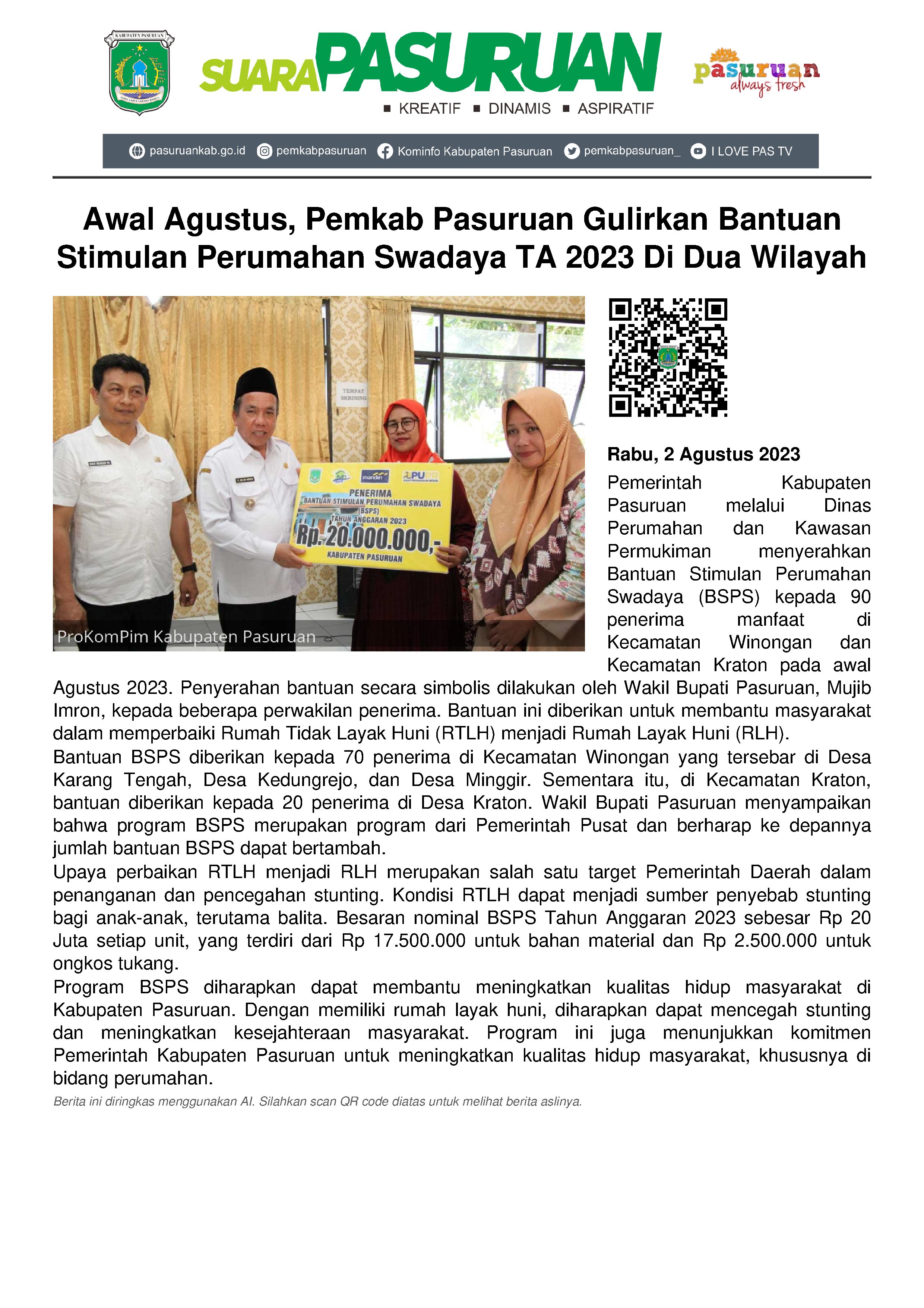 Di minggu pertama bulan Agustus 2023, Pemerintah Kabupaten Pasuruan melalui Dinas Perumahan dan Kawasan Permukiman menyerahkan Bantuan Stimulan Perumahan Swadaya (BSPS) kepada para penerima manfaat. Total ada 90 unit rumah yang tersebar di beberapa Desa di dua wilayah yang berbeda yakni Kecamatan Winongan dan Kecamatan Kraton. Â