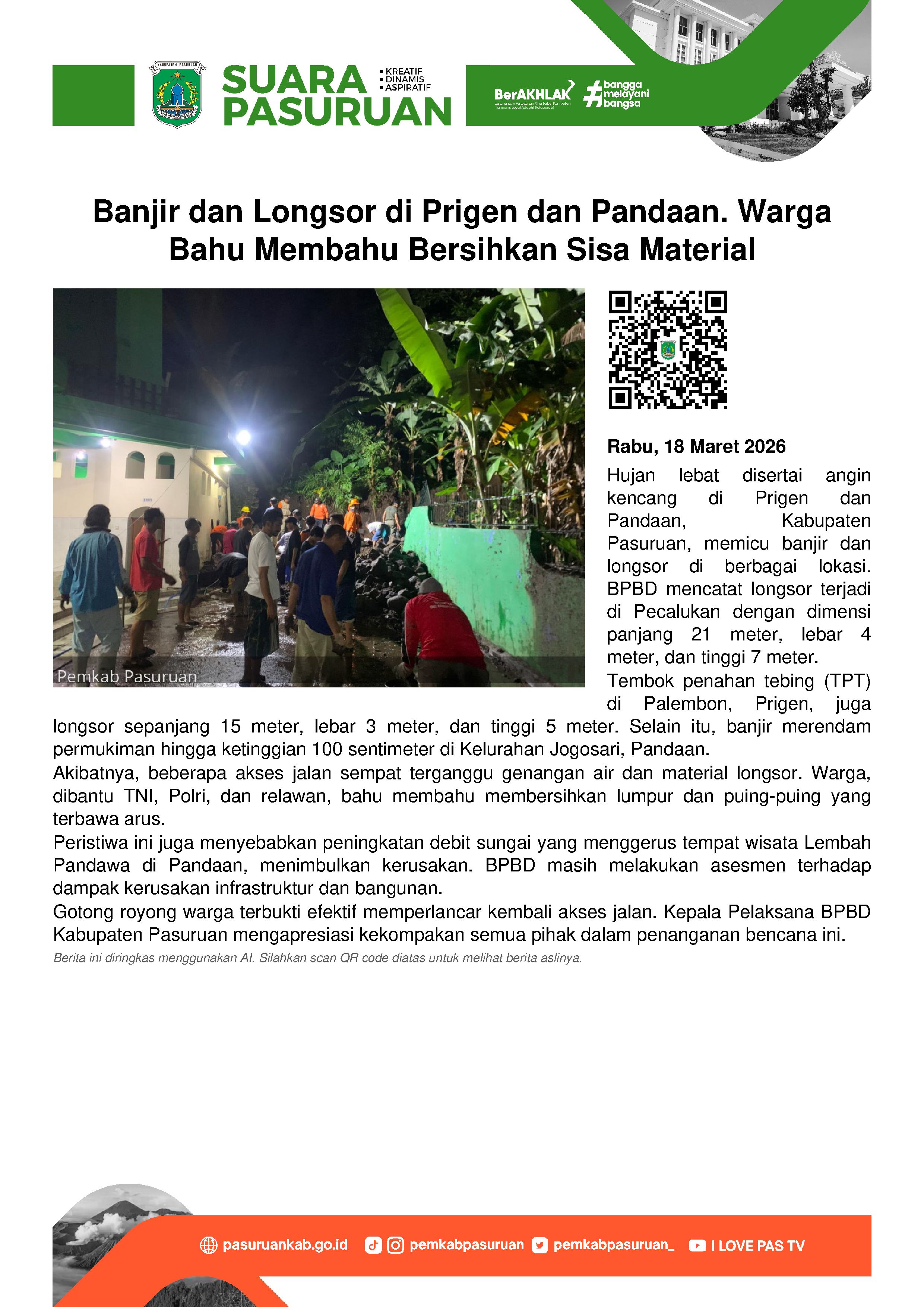 Intensitas hujan lebat plus angin kencang yang mengguyur wilayah Kecamatan Prigen, Kabupaten Pasuruan selama lebih dari satu jam pada Selasa (17/3/2026) sore, mengakibatkan banjir dan tanah longsor terjadi di sejumlah titik.