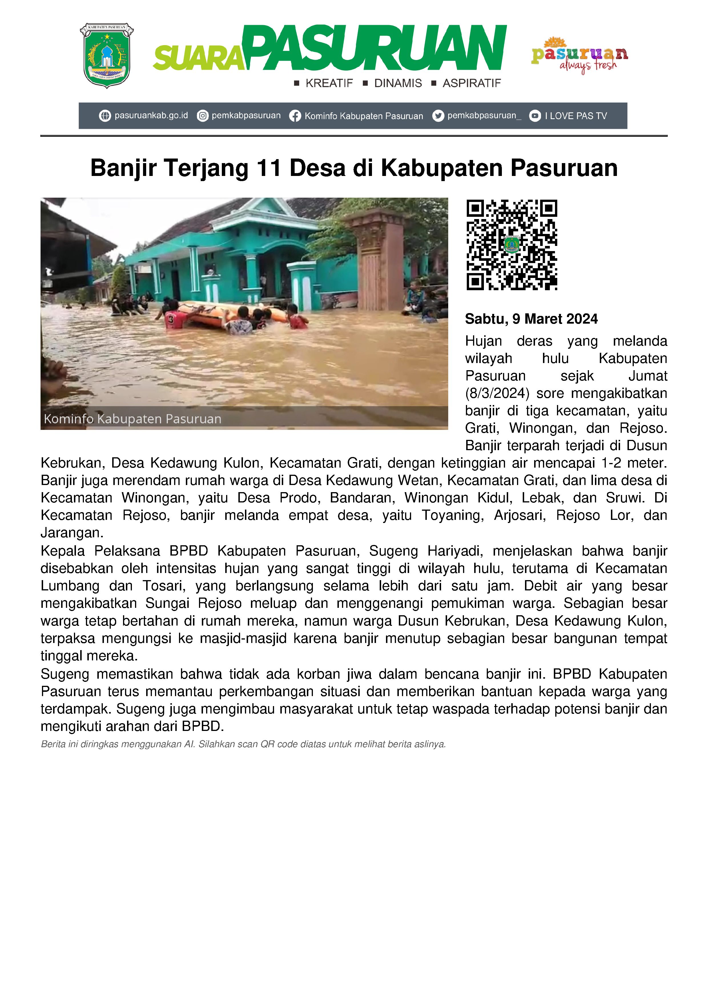 Hujan deras yang mengguyur wilayah hulu sejak Jumat (8/3/2024) siang-sore kemarin, mengakibatkan sejumlah wilayah di tiga kecamatan di Kabupaten Pasuruan, terendam banjir.