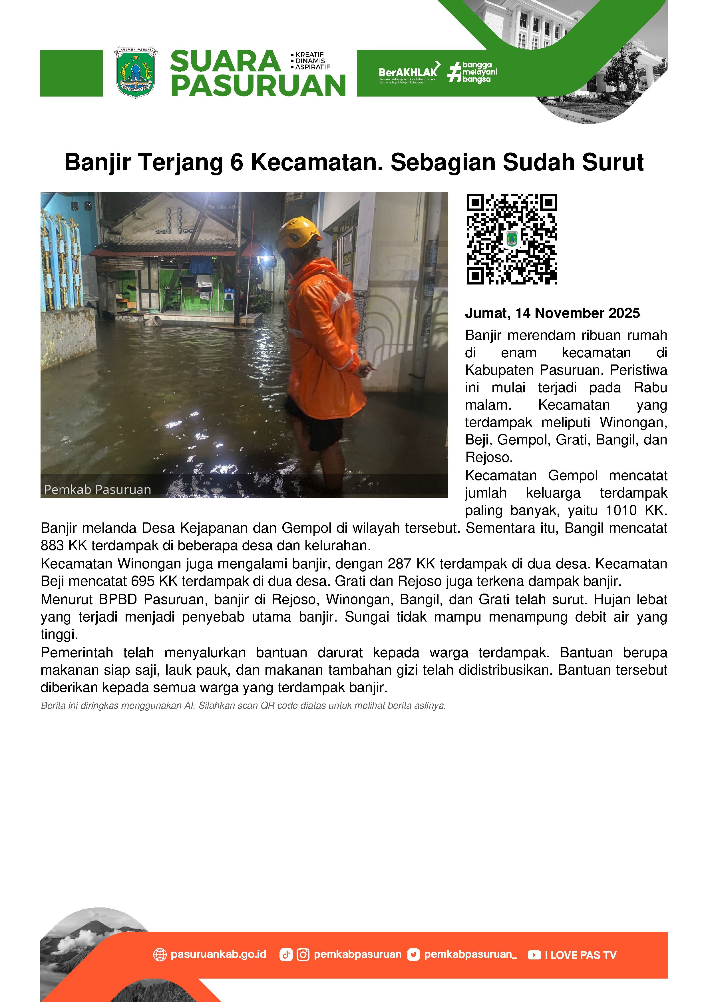 "Kalau yang paling besar di Gempol dan Bangil. Tapi kalau yang di Rejoso, Winongan, Bangil dan Grati sudah surut," kata Sugeng di sela-sela kegiatannya, Jumat (14/11/2025).