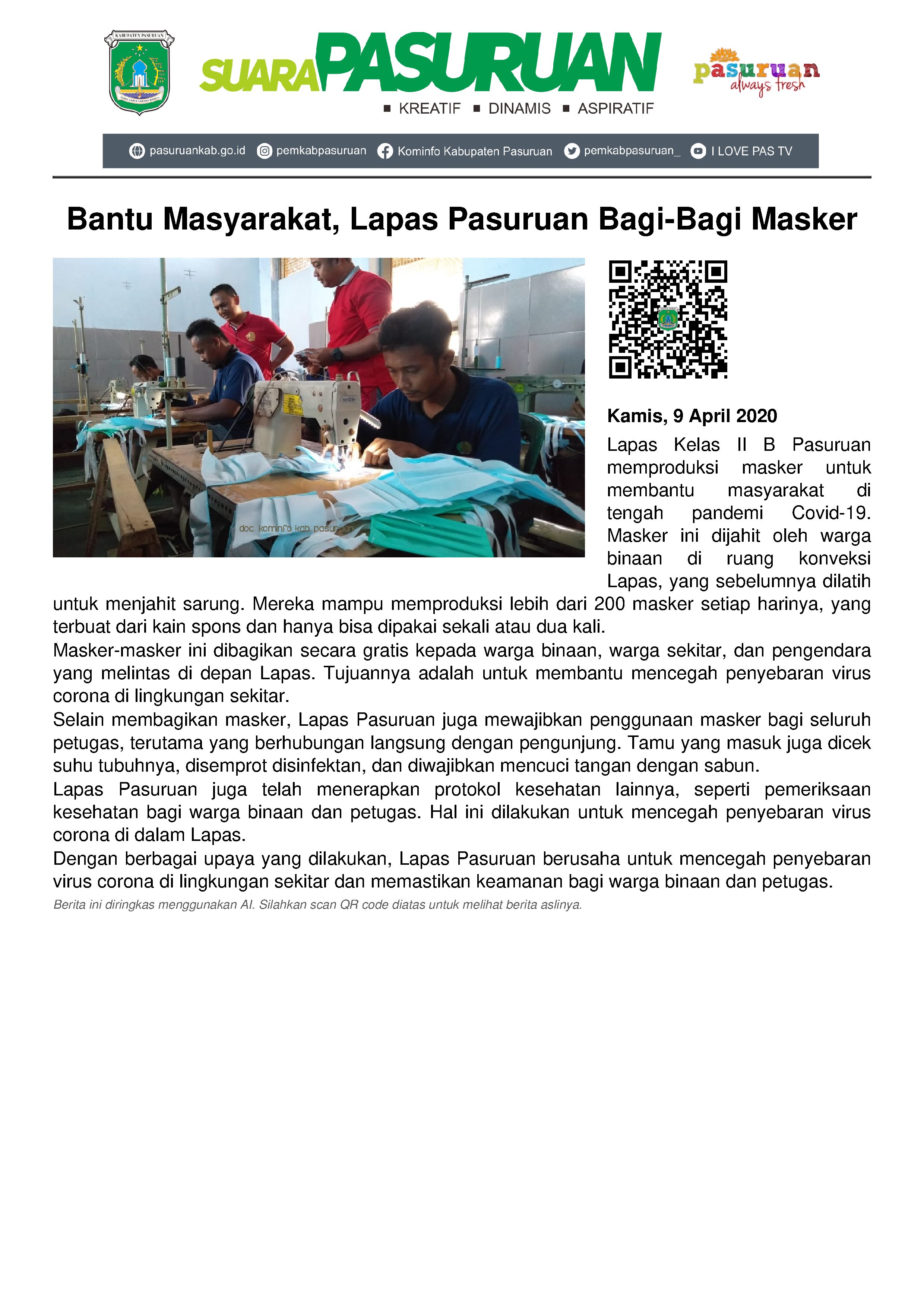 Untuk itulah, Lapas Kelas II B Pasuruan memproduksi masker hingga ratusan buah, yang siap dibagikan untuk seluruh warga binaaan dan masyarakat sekitar.