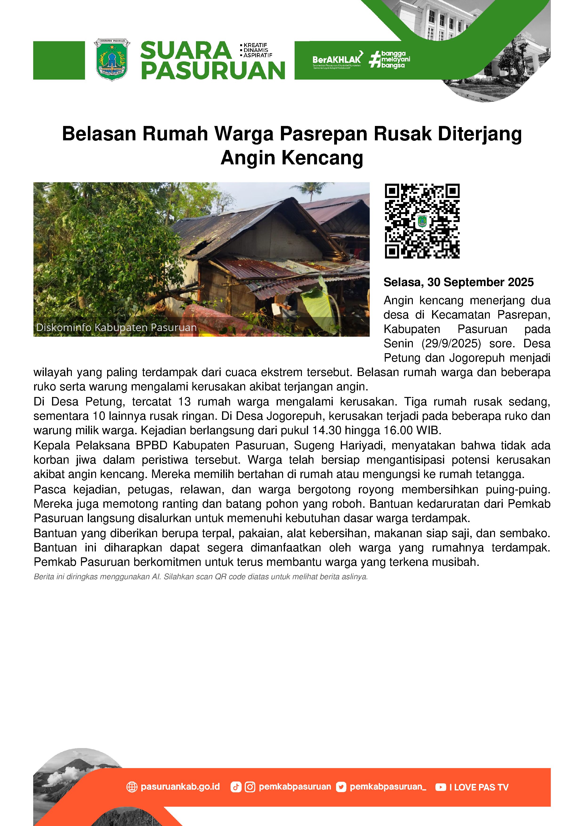 Belasan rumah warga di dua desa di wilayah Kecamatan Pasrepan mengalami kerusakan akibat dihantam angin kencang, Senin (29/9/2025) sore.