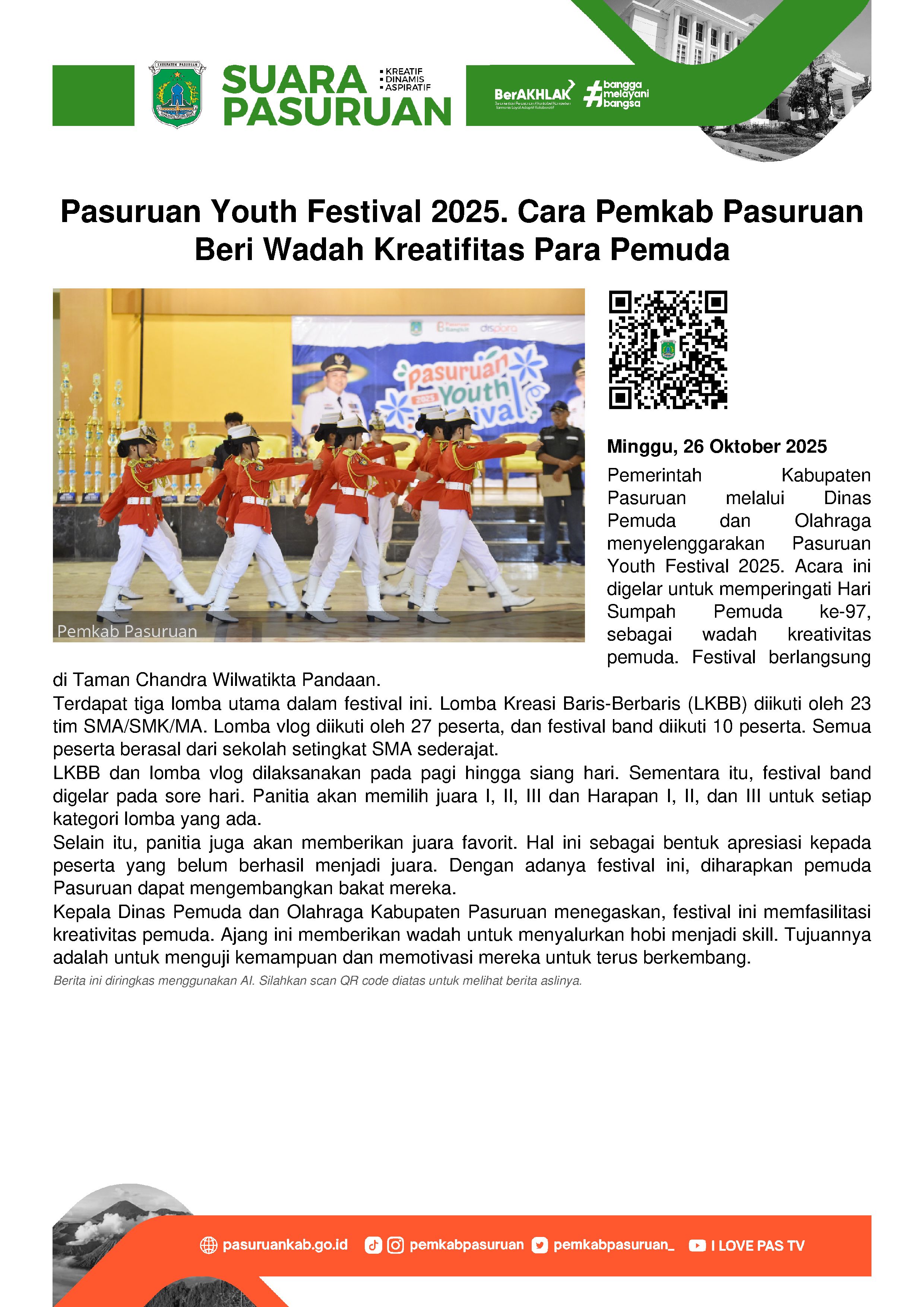 Panjenengan juga harus bangga mewakili Kabupaten Pasuruan. Atas nama pribadi