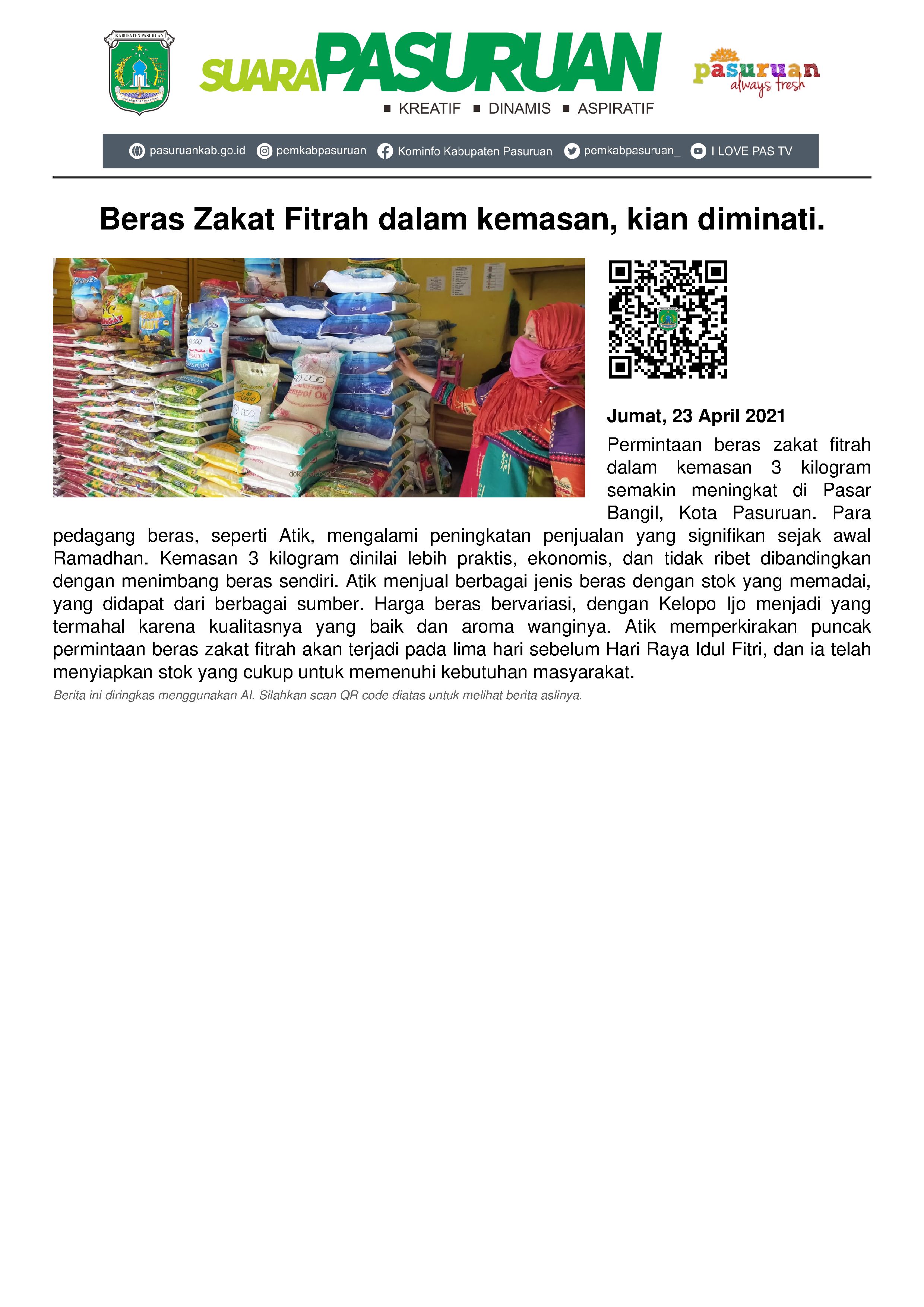 Sebagai buktinya, hampir semua pedagang yang khusus menjual beras di Pasar Bangil maupun Pasar tradisional di Kota Pasuruan, sama-sama dibanjiri warga yang ingin membeli beras zakat fitrah yang dikemas dalam berat 3 kilogram.