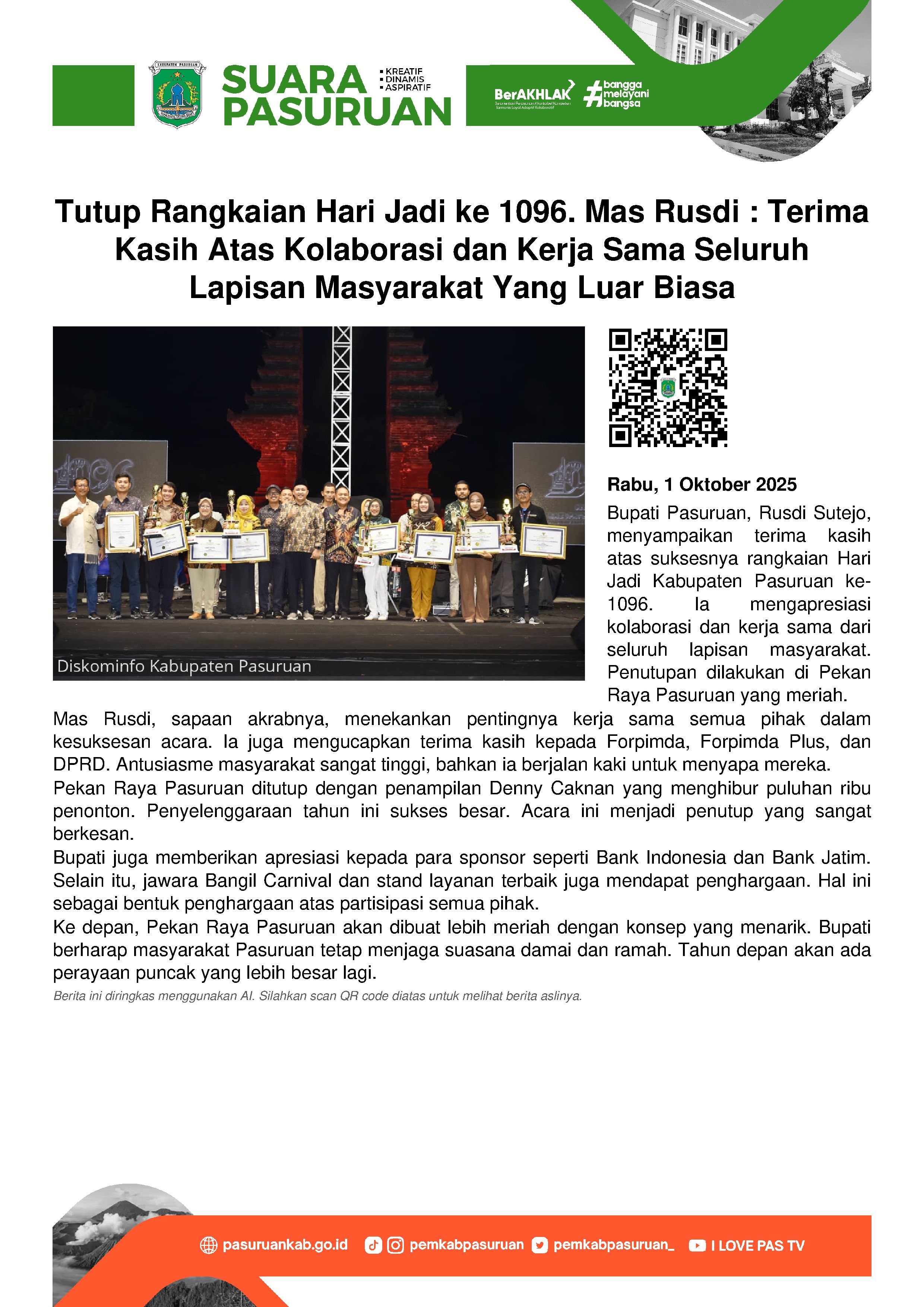 “Sekarang ini eranya keterbukaan publik. Jadi kita semuanya harus lebih memaksimalkan tugas dengan sungguh-sungguh. Terlebih, tantangannya juga sangat luar biasa. Terutama dari masih banyaknya infrastruktur yang harus dibangun. Ditambah lagi dengan pemotongan dana transfer dari Pemerintah Pusat ke daerah sebesar 330 Milyar,” katanya pada hari Jumat (17/10/2025) sore.