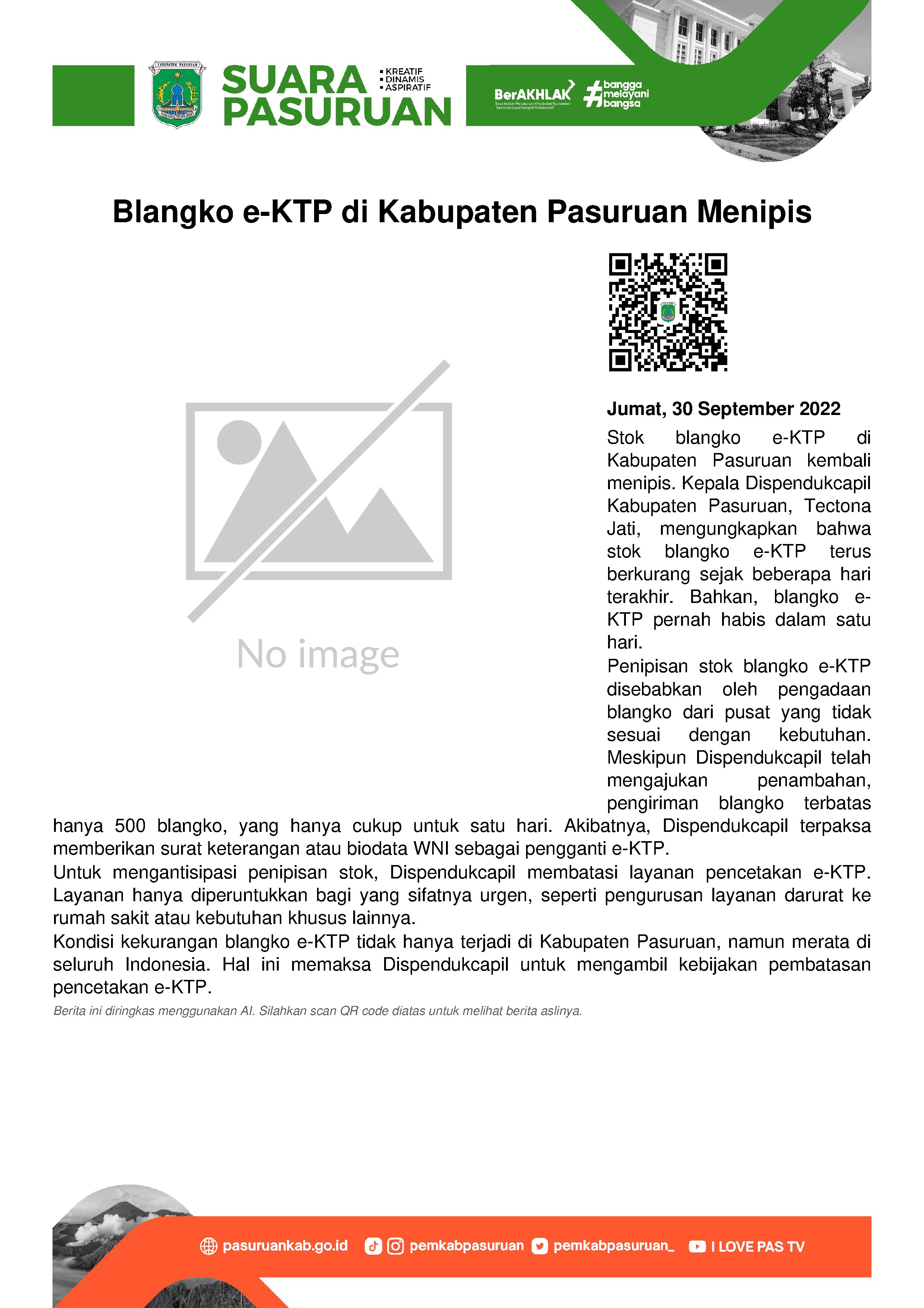 Ketersediaan blangko e-KTP alias KTP elektronik di Kabupaten Pasuruan kembali menipis.