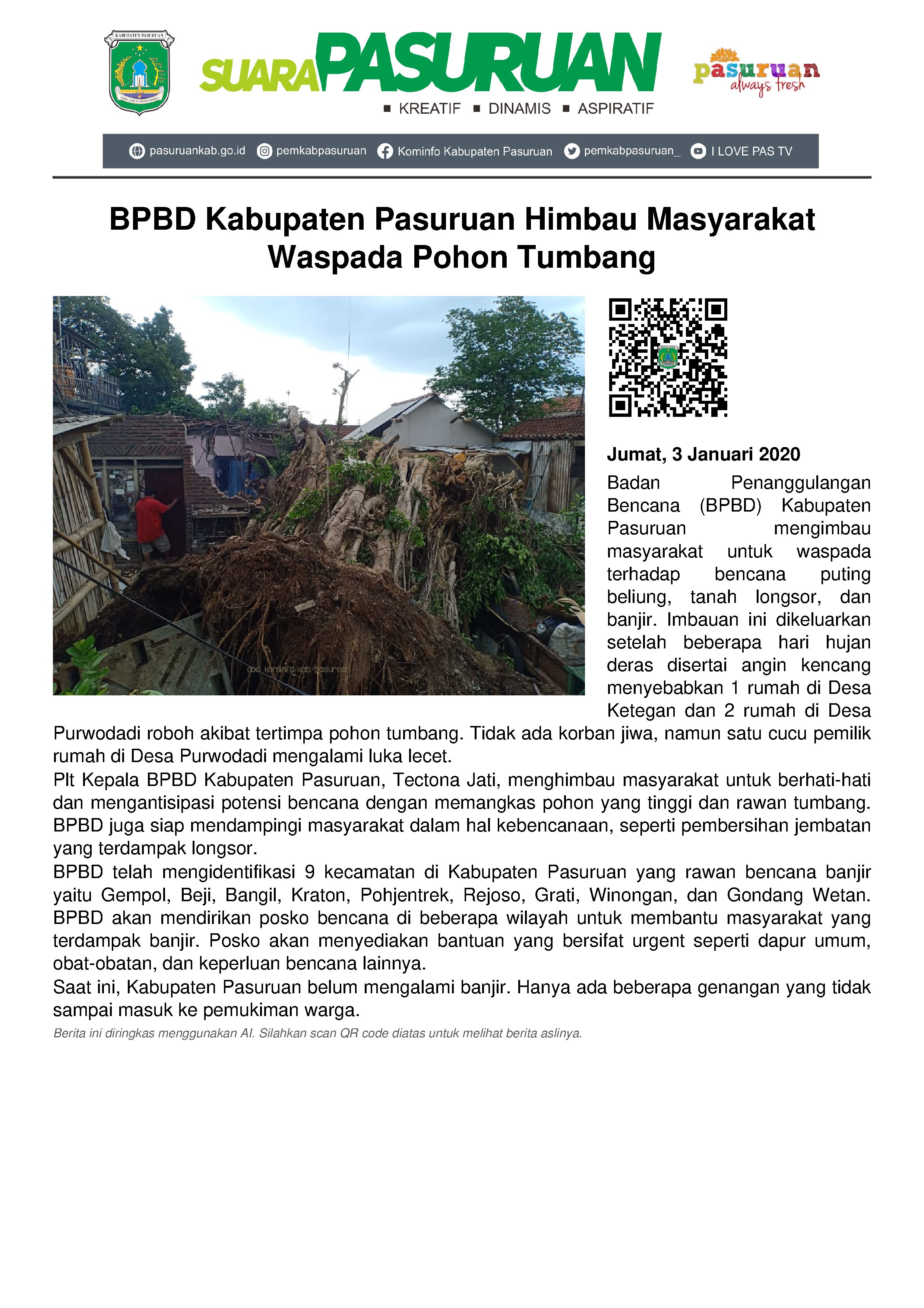 Plt Kepala BPBD Kabupaten Pasuruan, Tectona Jati mengatakan, 2 rumah warga yang tertimpa pohon tumbang di Desa Purwodadi terjadi pada Jumat (03/01/2020) pagi sekitar pukul 04.00 WIB. Beruntung, tidak ada korban jiwa dalam kejadian tersebut.