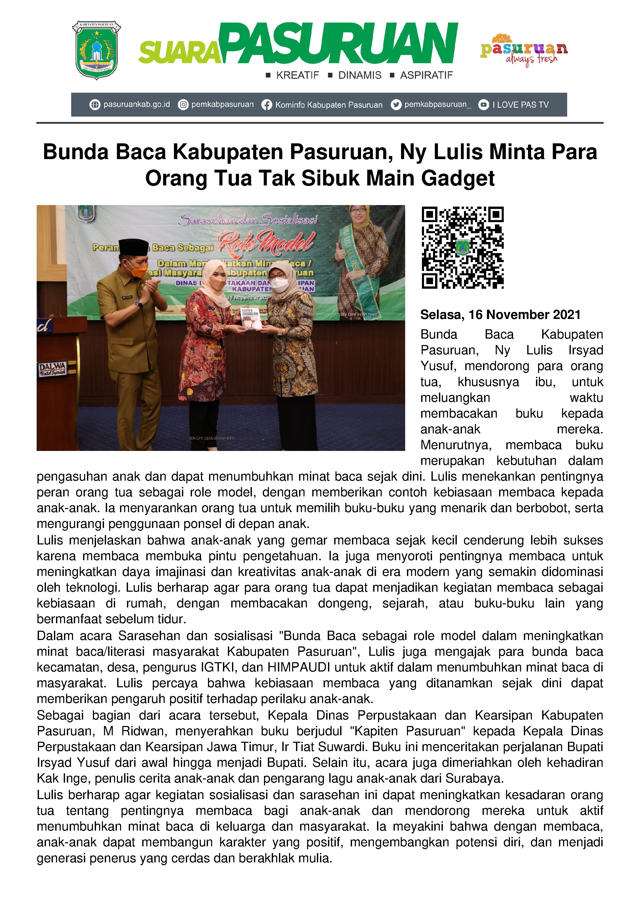 Ajakan tersebut disampaikan Lulis saat membuka Sarasehan dan sosialisasi bertema "Bunda Baca sebagai role model dalam meningkatkan minat baca/literasi masyarakat Kabupaten Pasuruan", di Hotel Dalwa, Selasa (16/11/2021) pagi.