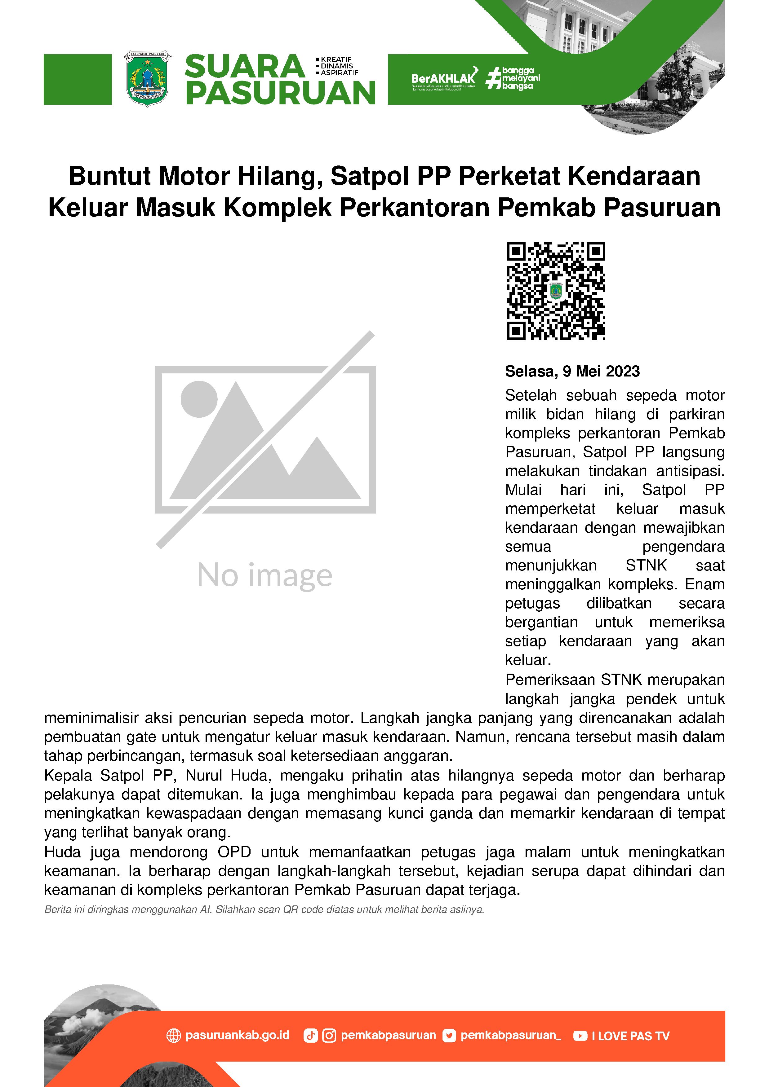 Pasca hilangnya sebuah sepeda motor milik bidan di parkiran komplek Perkantoran Raci, Kecamatan Bangil, pada Senin (08/05/2023) kemarin, Pemkab Pasuruan langsung melakukan tindakan antisipasi.