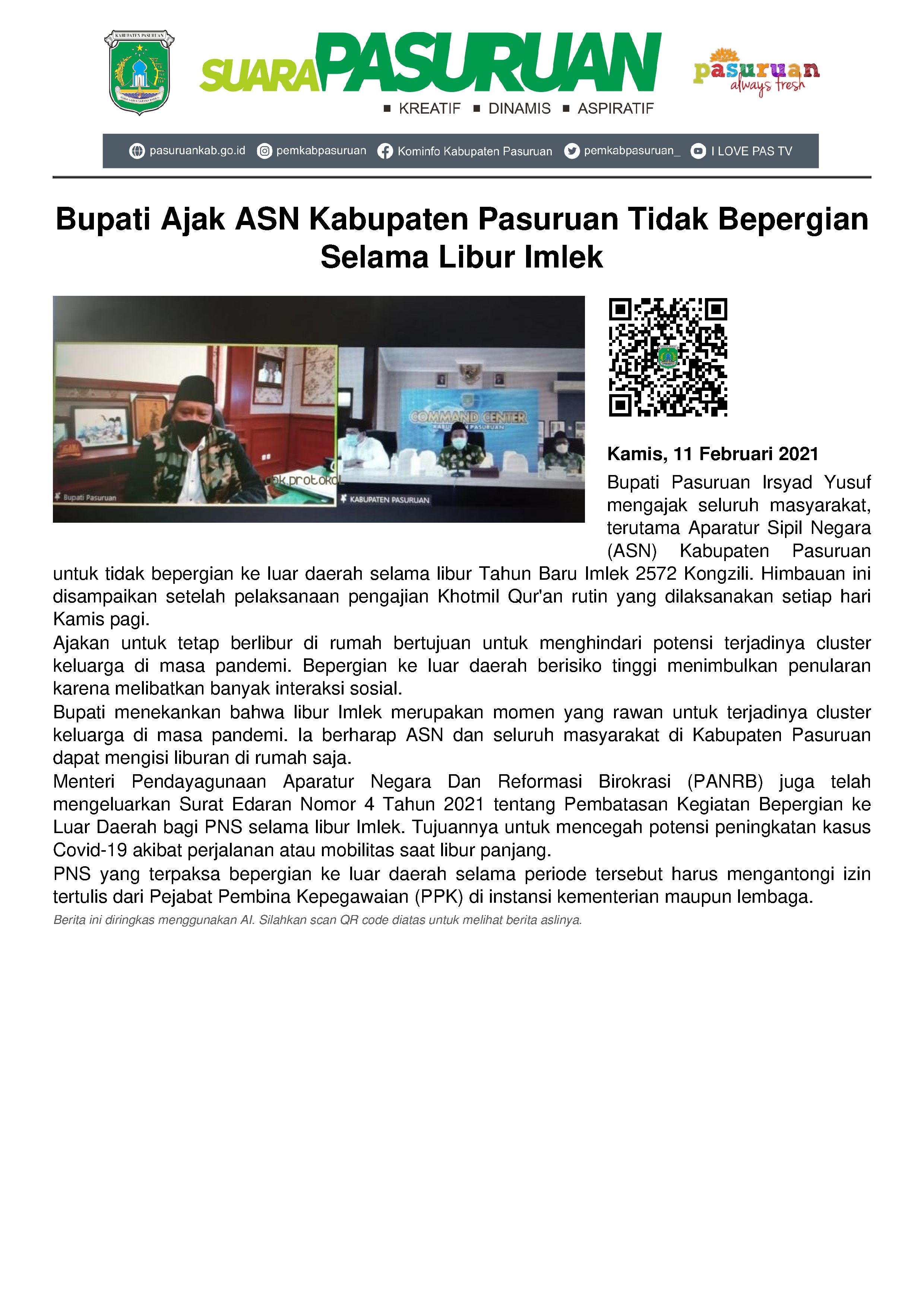 “Kami harapkan kepada seluruh masyarakat terutama ASN Kabupaten Pasuruan agar mengisi liburan di rumah saja. Tidak bepergian ke luar kota selama libur Imlek. Karena itu sangat rawan menimbulkan cluster keluarga di masa pandemi", himbau Bupati.