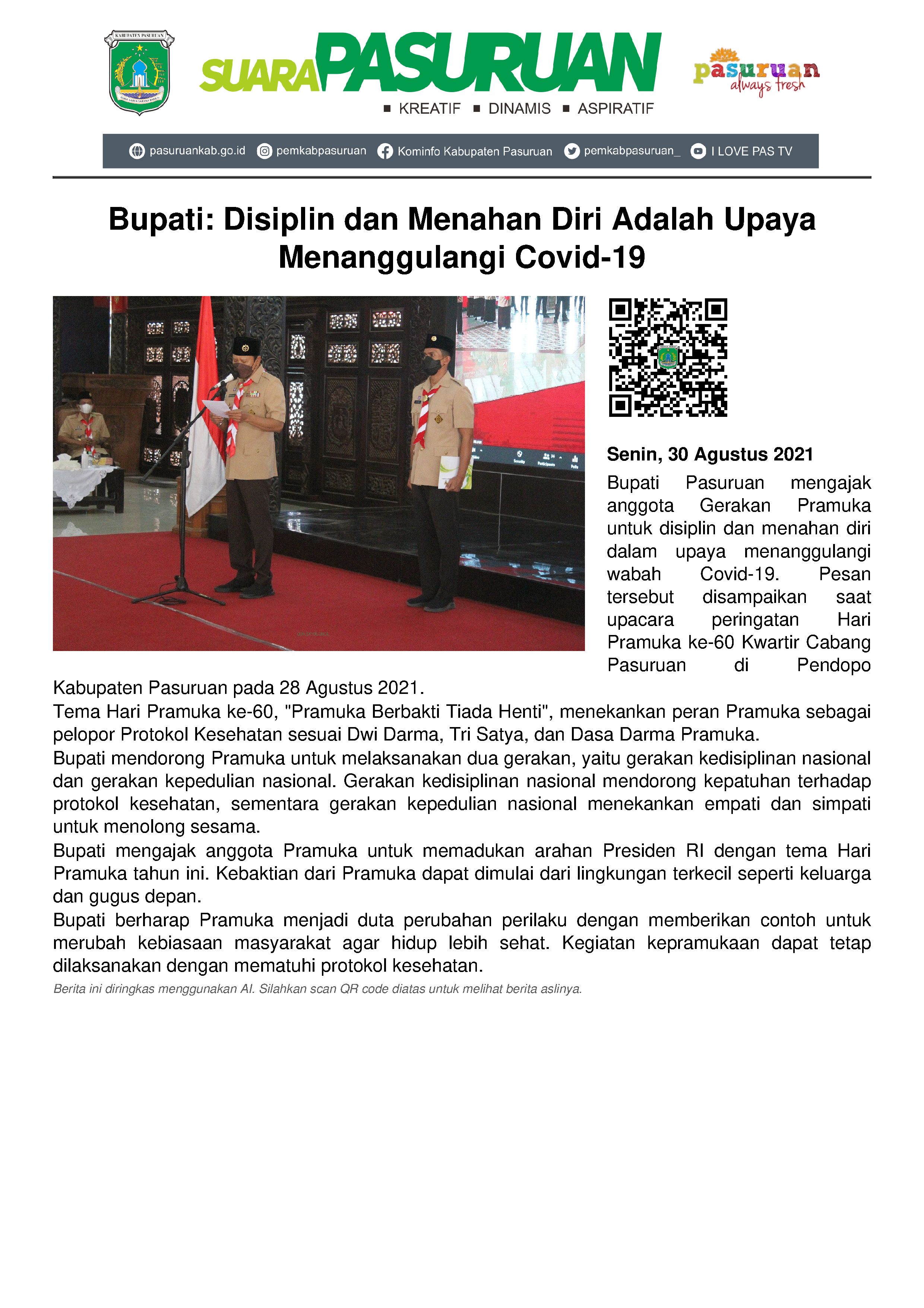 Bupati Pasuruan berpesan kepada seluruh anggota Gerakan Pramuka di Kabupaten Pasuruan untuk disiplin dan menahan diri dalam upaya untuk menanggulangi wabah penyebaran Covid-19. Pesan tersebut disampaikan langsung oleh Bupati Pasuruan saat upacara peringatan Hari Pramuka ke-60 Kwartir Cabang Pasuruan di Pendopo Kabupaten Pasuruan (28/8/2021).