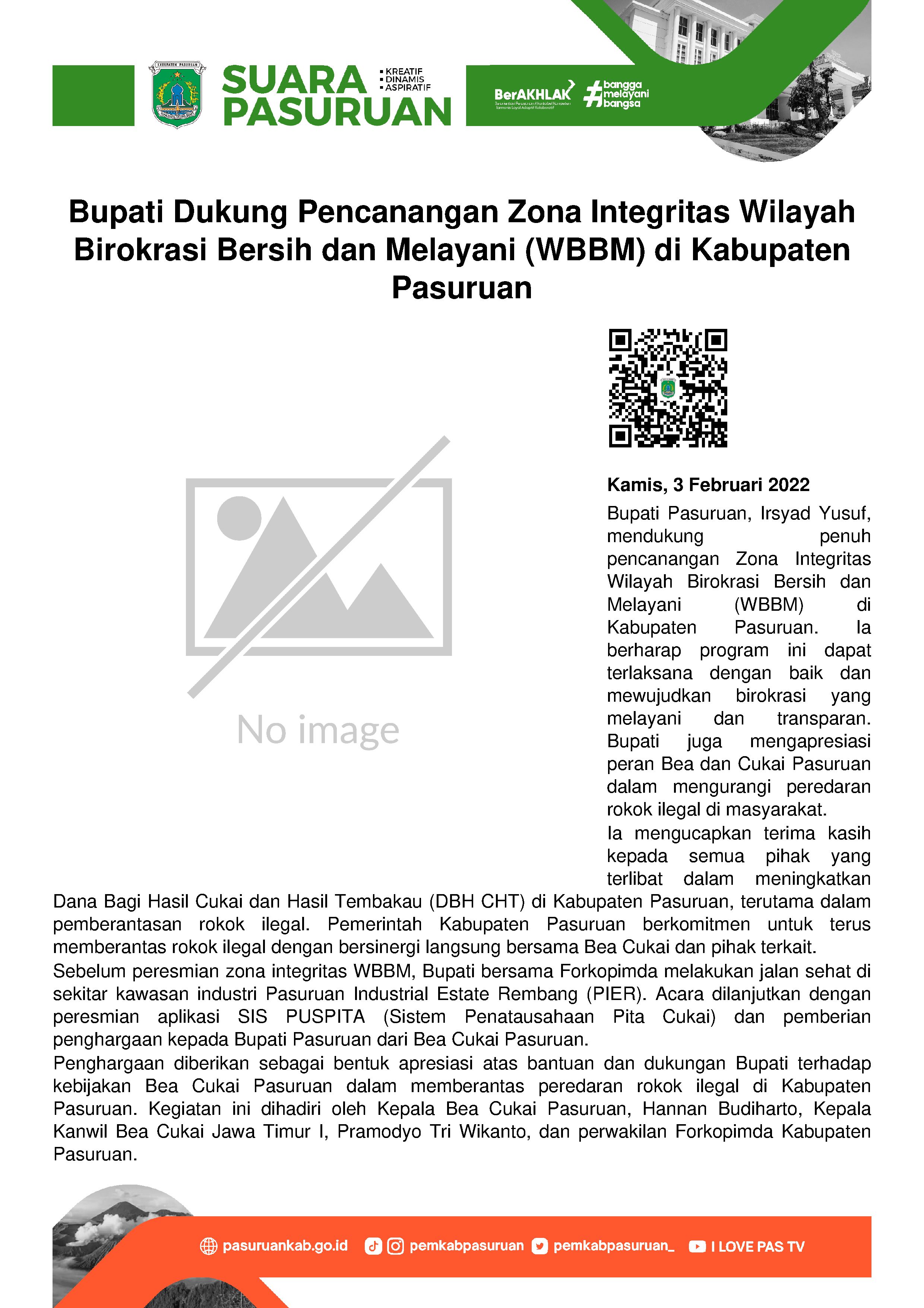 Bupati Irsyad Yusuf mendukung penuh pelaksanaan zona integritas Wilayah Birokrasi Bersih dan Melayani (WBBM) di Kabupaten Pasuruan. Pernyataan itu diungkapkan pada saat menghadiri pencanangannya bersama Forkopimda Kabupaten Pasuruan di kantor Bea dan Cukai Pasuruan.